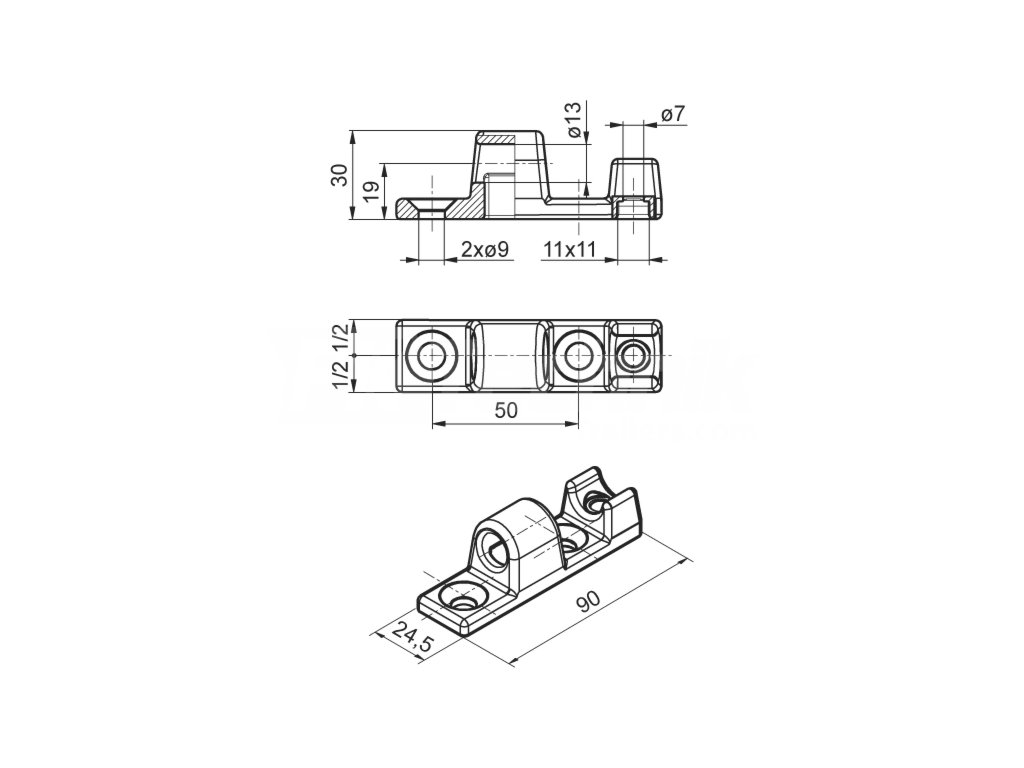- Rozteč montážních otvorů pro rám: 50 mm