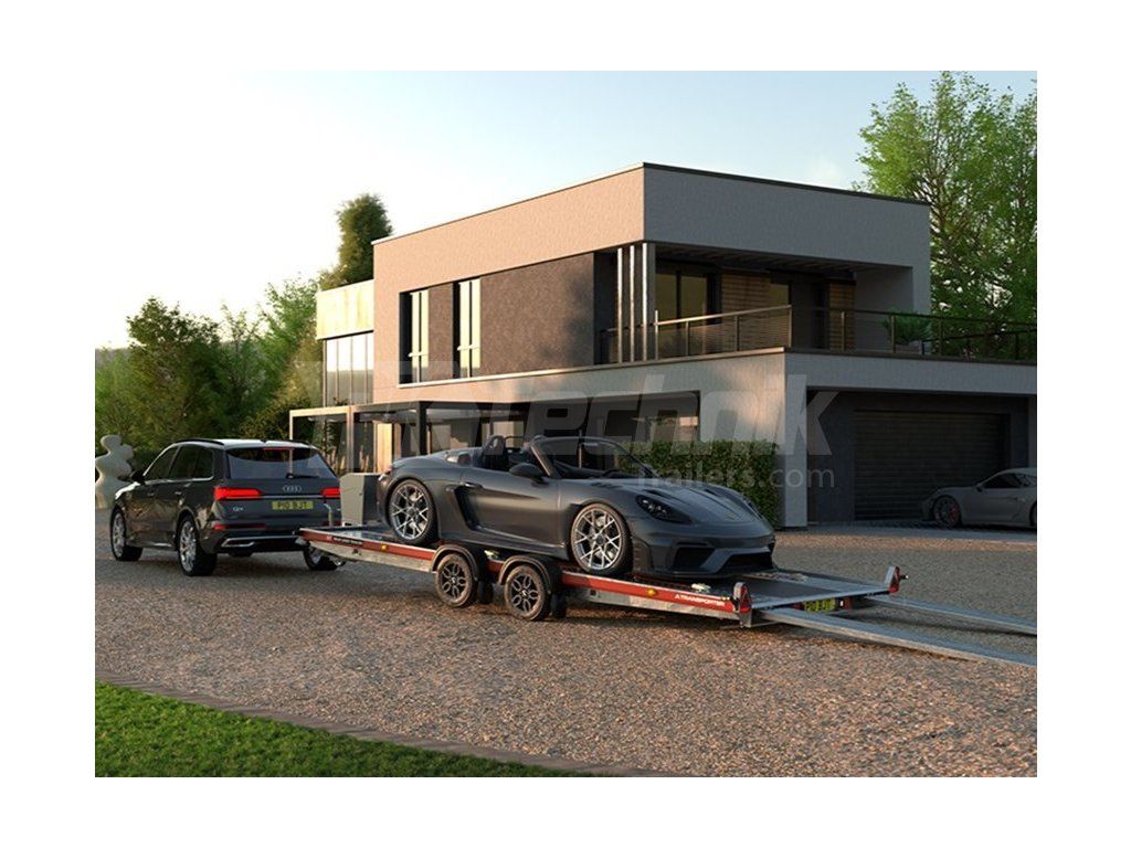 Brian James A Transporter ist ein modernisierter Autotransporter mit 3000 kg des Modelljahres 2025, entwickelt für den sicheren Fahrzeugtransport, Motorsport und professionelle Logistik. Er überzeugt durch eine sehr niedrige Ladefläche, eine flache Plattform und intern integrierte Easy-Glide-Rampen, wodurch auch sehr niedrige Fahrzeuge mit minimalem Auffahrwinkel verladen werden können.