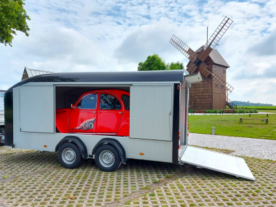 Der Debon C900 Kofferanhänger ist der komfortabelste geschlossene Fahrzeugträger der französischen Marke Cheval Liberté, die die begehrtesten Anhänger Europas herstellt. Debon C900 ist derzeit der zweitgrößte Anhänger, den das Unternehmen produziert. Es handelt sich um einen überdachten Autotransporter, der speziell für Fahrzeuge konzipiert wurde, aber natürlich kann er für den Transport von allem Möglichen verwendet werden, der Fantasie sind keine Grenzen gesetzt. Die größtmögliche Breite der transportierten Last beträgt 1780 mm, die Höhe 1800 mm.