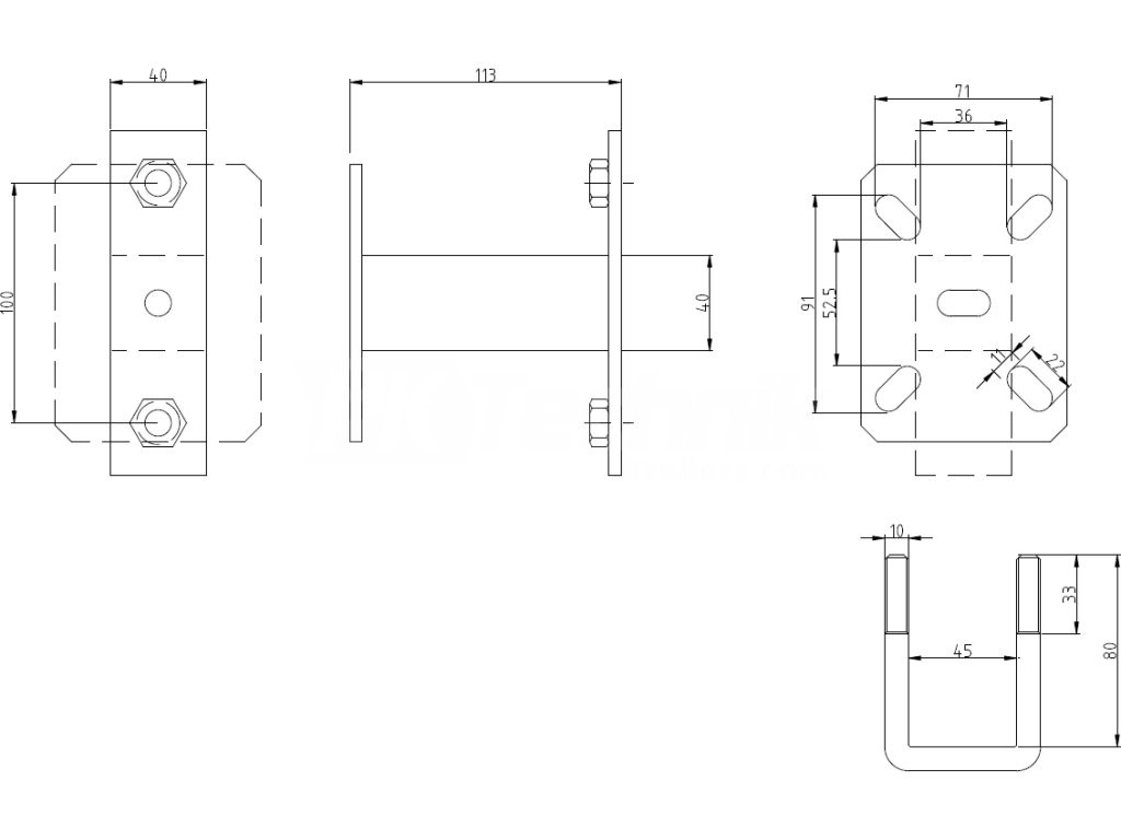 Držák rezervního kola přívěsu s roztečí kolových šroubů 4x100. Pro montáž kola ve vodorovné poloze na jeklový profil šíře 35 až 70 mm, třmeny pro uchycení nejsou součástí dodávky. Držák je nutné montovat tak, aby bylo kolo upevněno v poloze horizontální. Výrobek není určen pro montáž kola do vertikální polohy.