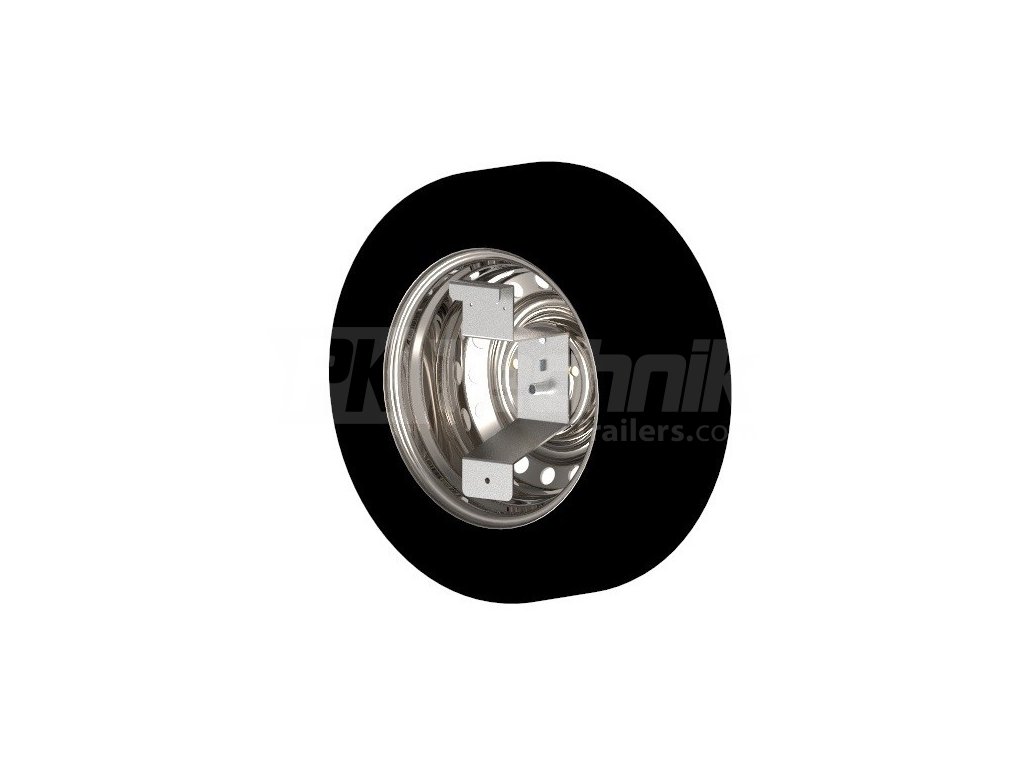 Uzamykatelný držák rezervního kola pro nákladní sklápěcí přívěsy, pro montáž na čelo bočnice. Pro kola s roztečí šroubů 5x112. Nejvhodnější je umístění na přední bočnici přívěsu. Rezervní kolo je zajištěno příložkou a nerezovým šroubem s kličkou.