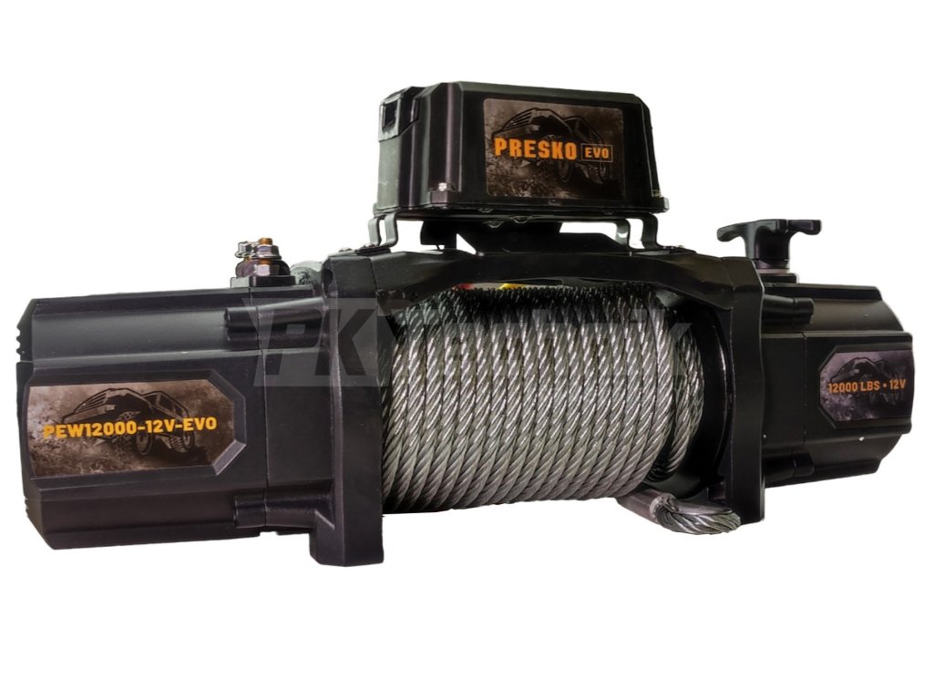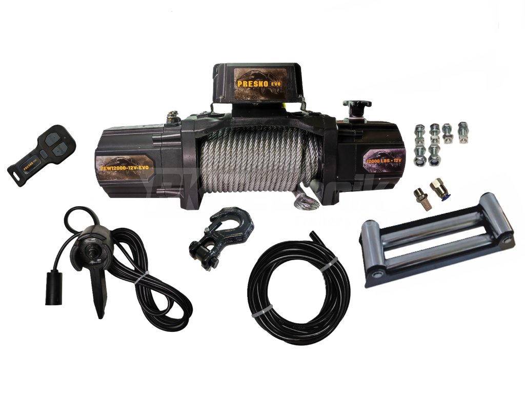 Elektrický naviják PRESKO PEW 12000 EVO, s trakcí až 5,5 tuny. Je ideální pro montáž na odtahové vozy či přívěsy, pro tahání veškerých osobní a užitkových automobilů, včetně SUV 4x4 vozů. Součástí balení je ocelové lano 9.5 mm, 24 m, manuální a dálkové ovládání, průvlak a hák pro lano.