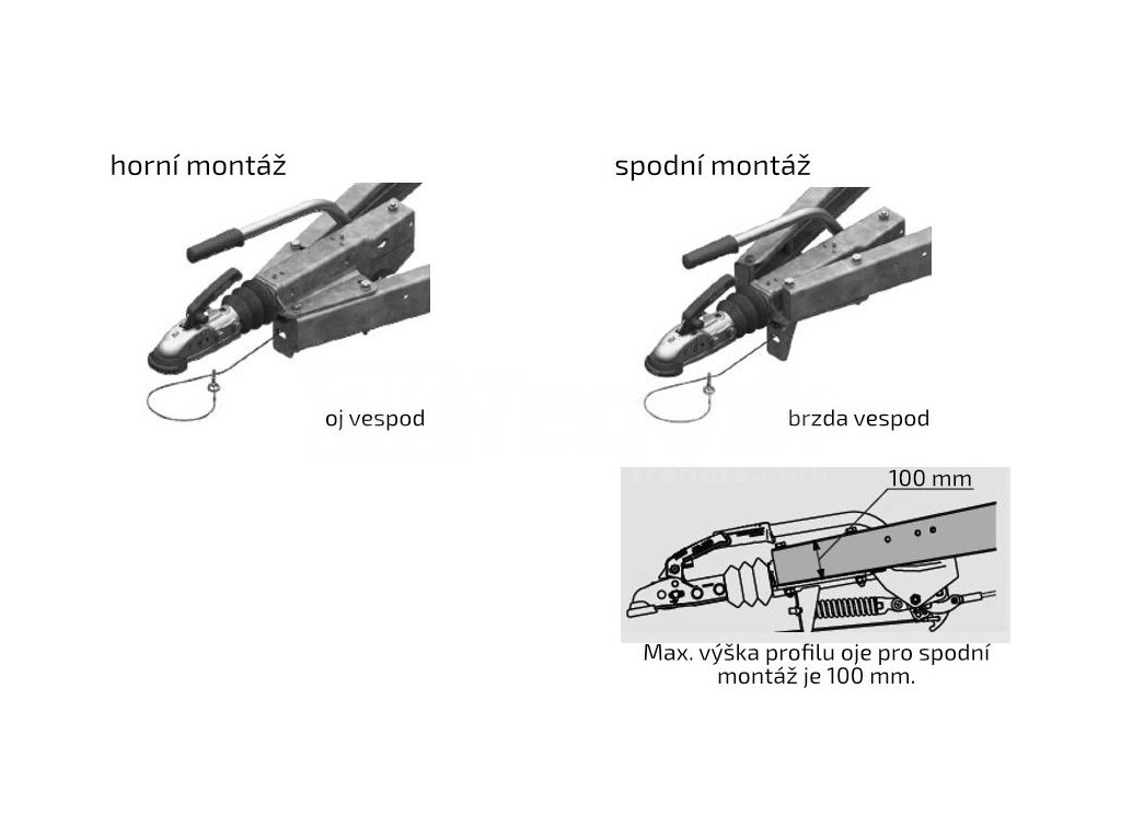- Compared to the standard version, this brake does not differentiate between top and bottom mounting. The brake can be mounted in both ways, i.e. with the axle underneath (so-called "top mounting") and with the brake underneath (so-called "bottom mounting"). The bottom mounting can be used for lugs with a profile up to 100 mm high.