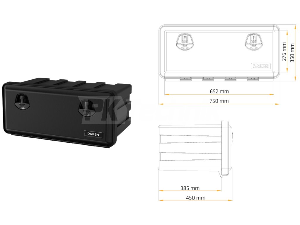 The JUST 750 box is an efficient solution for today's commercial vehicle and trailer equipment requirements. Excellent quality materials, attention to detail and design make JUST boxes an essential accessory for every trailer. The elaborate structure of the box seals ensures dust and water resistance. The material produced from raw materials (without the addition of recyclates) ensures high resistance to UV radiation, oils, fuels, high and low temperatures and is also non-flammable.