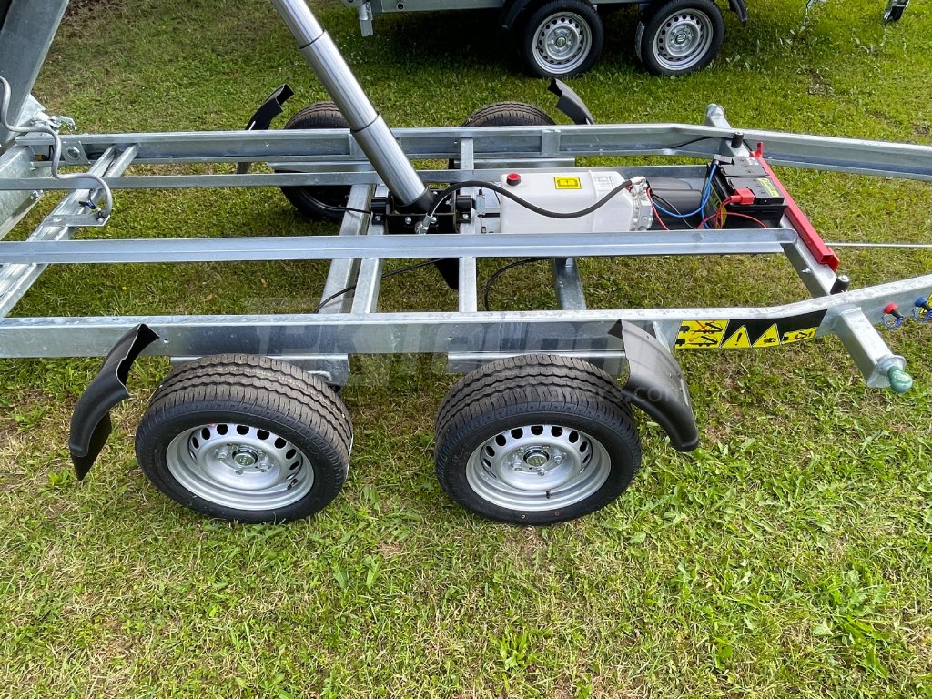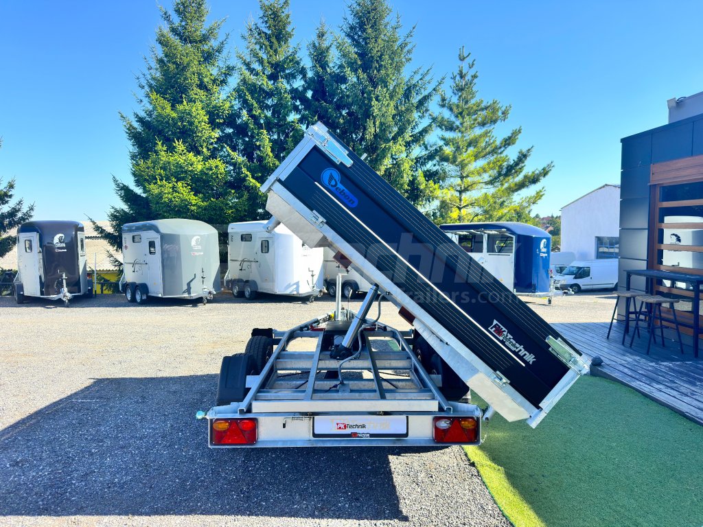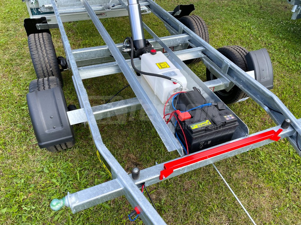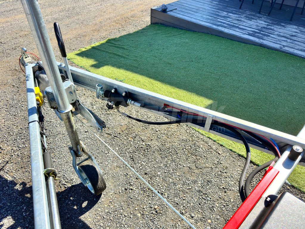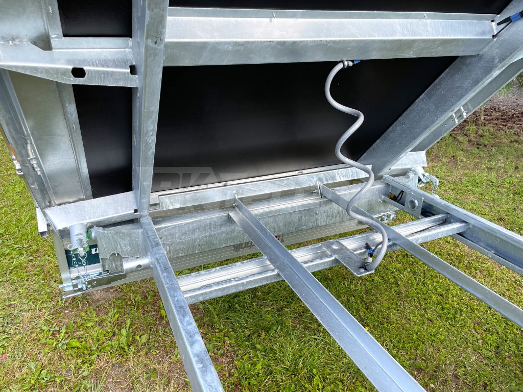 The electrohydraulic folding flatbed trailer DEBON PW 3. 3 from the renowned French company Cheval Liberte - Debon is characterized by universal use and high durabilitythanks to the use of the most modern technologies in production. It is equipped with a built-in accumulator for independent tipping of the superstructure without the need to connect the trailer to a power source, and this model, the Debon PW 3.3, is also equipped with a manual (hand) pump, for possible "emergency" lifting of the load compartment, the superstructure. The trailer is constructed on a galvanized steel frame, which is manufactured using the most modern CNC machines, fitted with axles from the German company KNOTT, black removable side panels made of anodized EUROLOCK aluminum profiles, which can be completely dismantled from all sides, including the posts, to create a flat platform for transporting various loads.