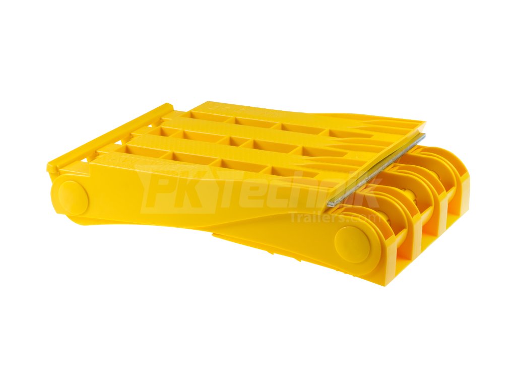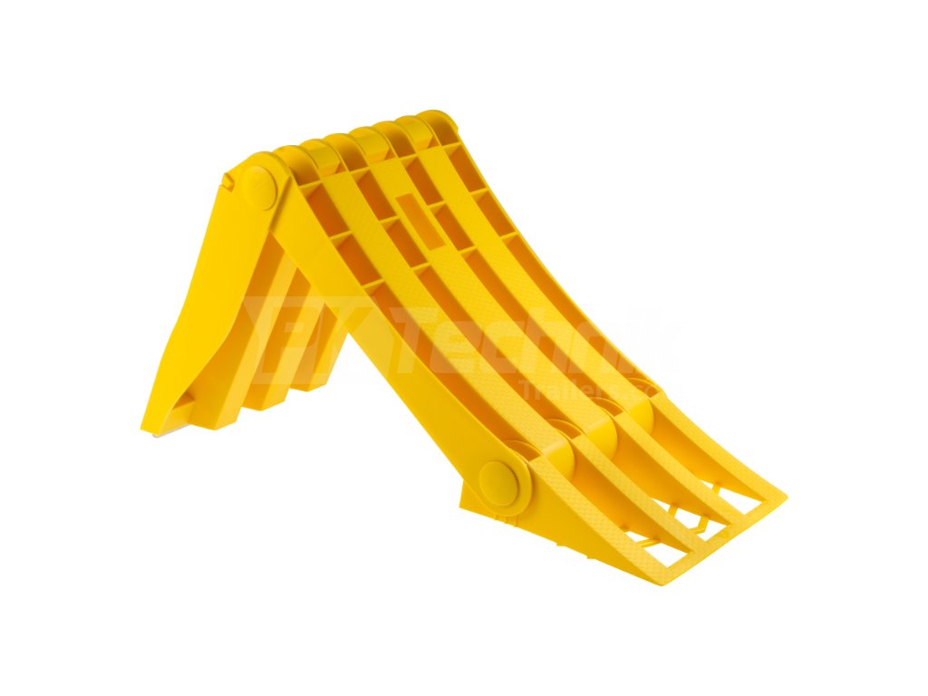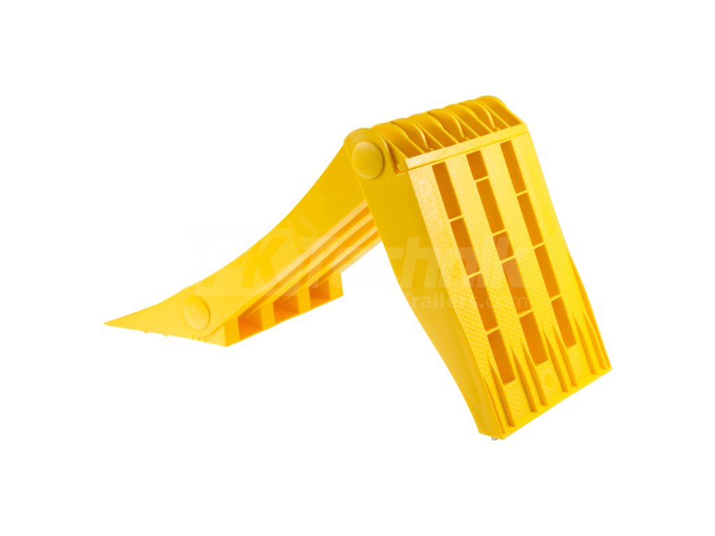 The wedge can be used separately or together with the holder (holder not included) for easy attachment of the wedge to the trailer or car frame. The elongated flat base allows the tire to be slightly driven onto the wedge so that the wedge is compressed against the ground and does not shift.