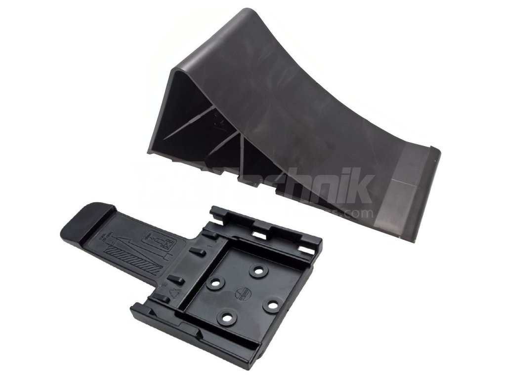 The wedge can be used alone or together with a bracket (bracket not included) for easy attachment of the wedge to the trailer or car frame. The extended flat base allows the tyre to be driven slightly onto the wedge so that the wedge is pressed against the road and does not shift.