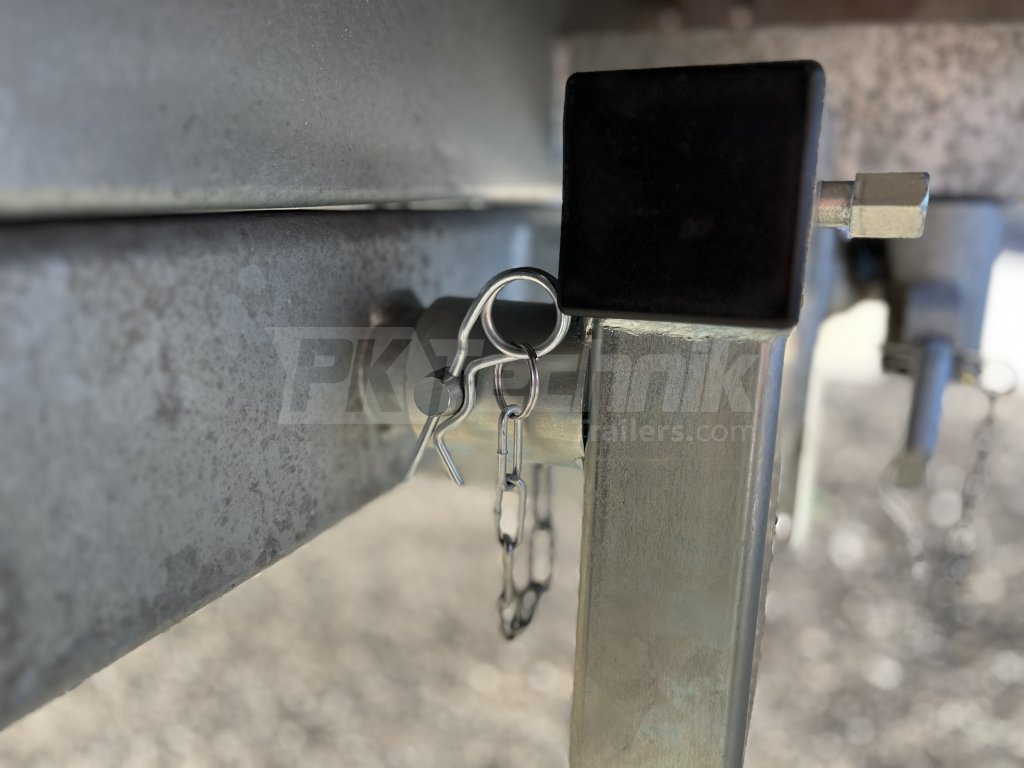 Pata de apoyo original DEBON PW. Pata de apoyo KNOTT para remolques basculantes DEBON PW. La pata puede girar libremente en la brida y fijarse en posición vertical u horizontal mediante un pasador de bloqueo. Girando el hexágono de 19 mm la pata puede extenderse hasta 220 mm.