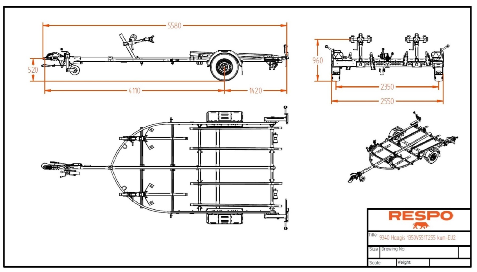 Vysoce odolný, brzděný přepravník pro dva vodní skútry RESPO 1350V551T255. RESPO T255 přívěs vyšší kvality pro přepravu dvou vodních skútrů, s žárově zinkovaným rámem, odolnými plastovými blatníky, je osazen torzní nápravou. Dva manuální navijáky s popruhy umožňují snadné naložení i vyložení přepravovaných vodních skútrů. Stojany pro manuální navijáky s popruhy jsou nastavitelné vodorovně i svisle, tím usnadní manipulaci. Držáky pro vodní skútry lze bez námahy nastavit dle individuálních potřeb uživatele.