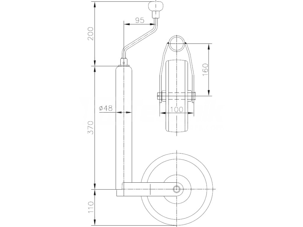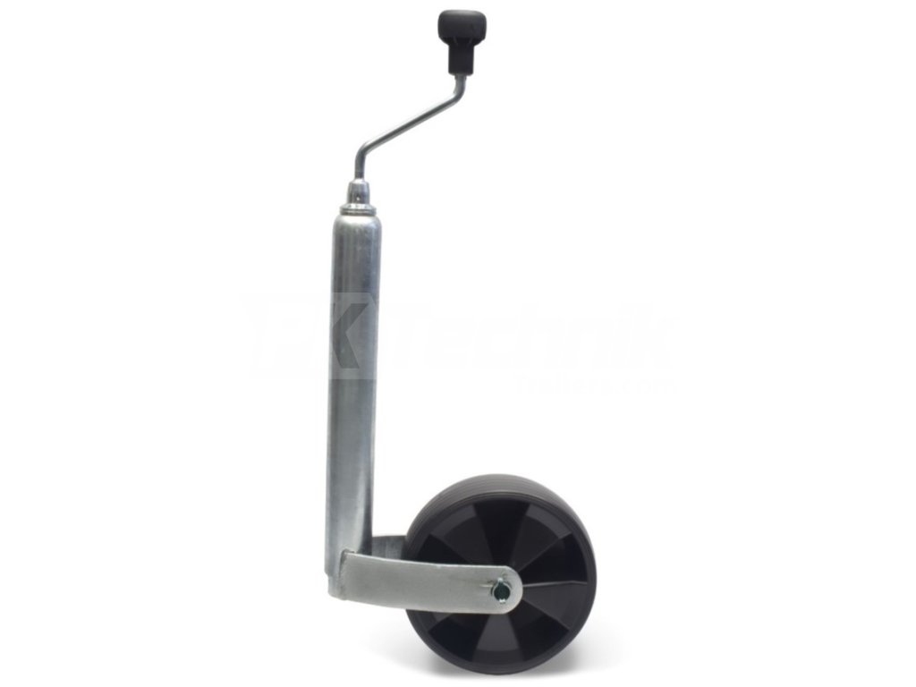 Opěrné pojezdové kolečko vhodné pro obytné přívěsy - opěrné kolečko pro karavany. Díky rozšířenému běhounu kolečka nabízí oproti běžným kolečkům pohodlnější manipulaci na trávě či písku, při pojíždění se nezaboří do sypkého podkladu. Noha kolečka je vybavena pohodlnou kličkou. Vhodné pro nebrzděné i brzděné přívěsy. Disk kolečka je vyroben z odolného plastu. Vysoké madlo umožňuje pohodlný úchop při točení kličkou.