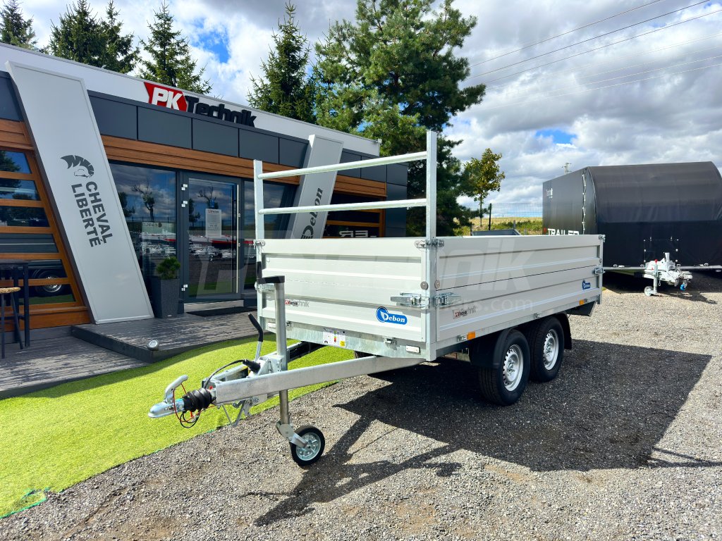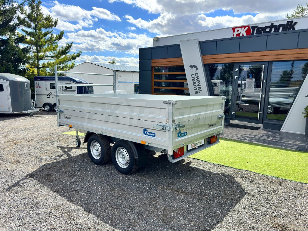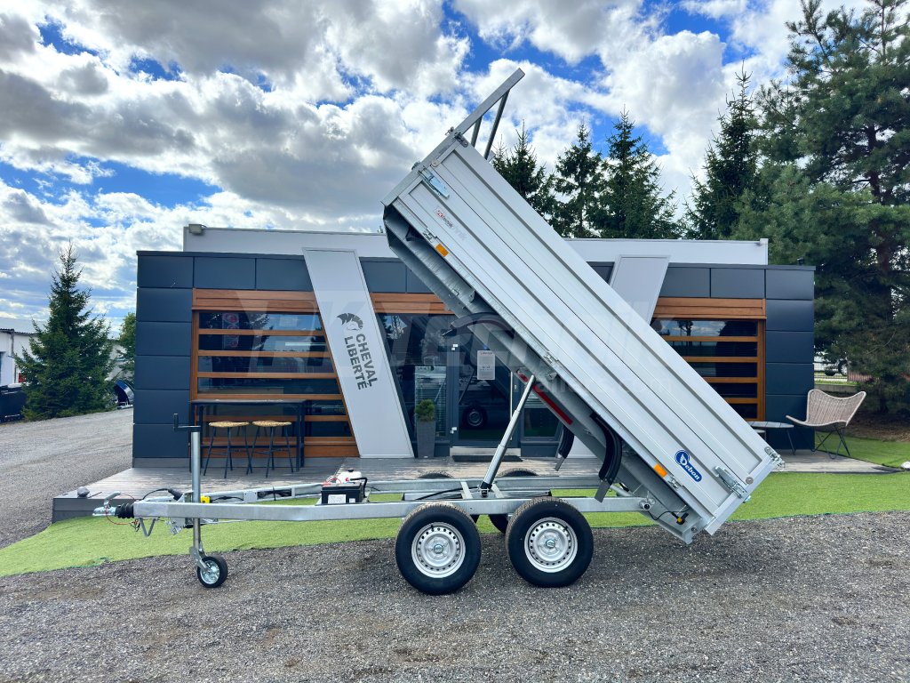 Manuálně sklopný univerzální valník, nákladní přívěs přední francouzské společnosti Cheval Liberté DEBON TIPPER PW 1.2 ECO s vestavěnou dvojčinnou manuální pumpou pro sklápění nástavby. Přívěs konstruován na ocelovém pozinkovaném rámu, osazen nápravami německé společnosti KNOTT a odnímatelnými bočnicemi z eloxovaných hliníkových profilů EUROLOCK, které jsou sklopné ze všech stran a snadno odnímatelné. Taktéž díky odnímatelnosti nejen všech bočnic, ale také všech sloupků, lze z přívěsu vytvořit rovné plato pro převoz nejrůznějších nákladů. Podlaha nástavby vyrobena z voděodolné přívěsové překližky. Velmi kvalitní zpracování nejmodernějšími technologiemi pro každodenní profesionální použití. Základní celkovou hmotnost přívěsu vám, jako akreditovaný importér pro ČR schválený ministerstvem dopravy, můžeme snížit z 2000 kg až na 1100 kg.