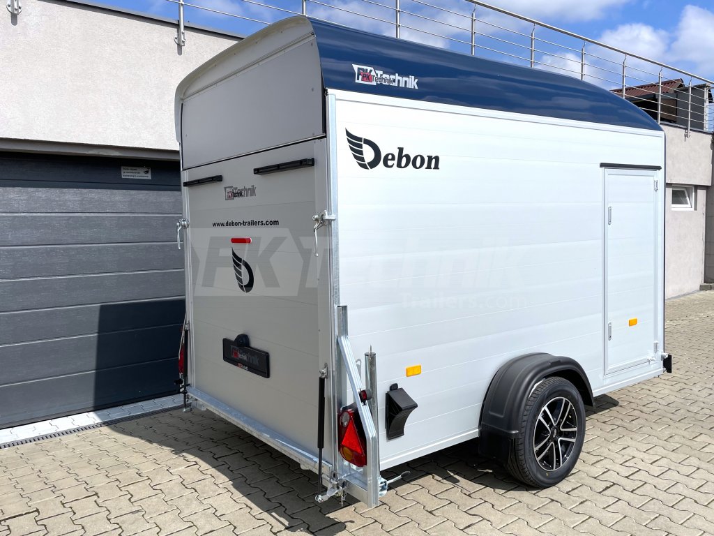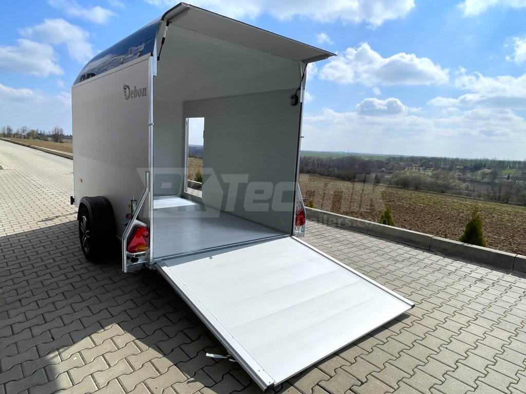 Samozřejmostí je také automatické opěrné kolečko a zadní podpěrné nohy, které umožňují snadné a pohodlné nakládání a vykládání přepravovaného nákladu bez nutnosti připojení přívěsu k vozidlu. Skříňový přívěs Debon C400 má uzamykatelné boční dveře a odolná hliníková kola. Základní celkovou hmotnost přívěsu vám jakožto ministerstvem dopravy oficiálně akreditovaný importér pro ČR můžeme snížit z 1300 kg až na 750 kg.