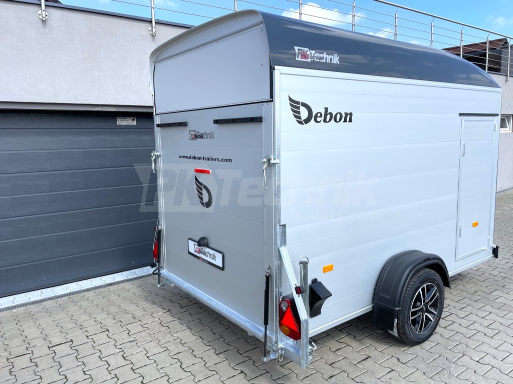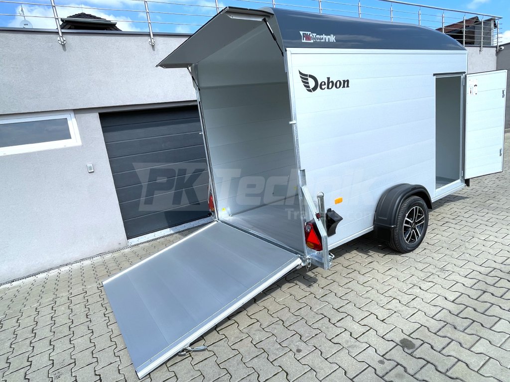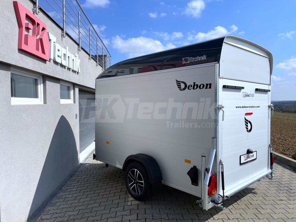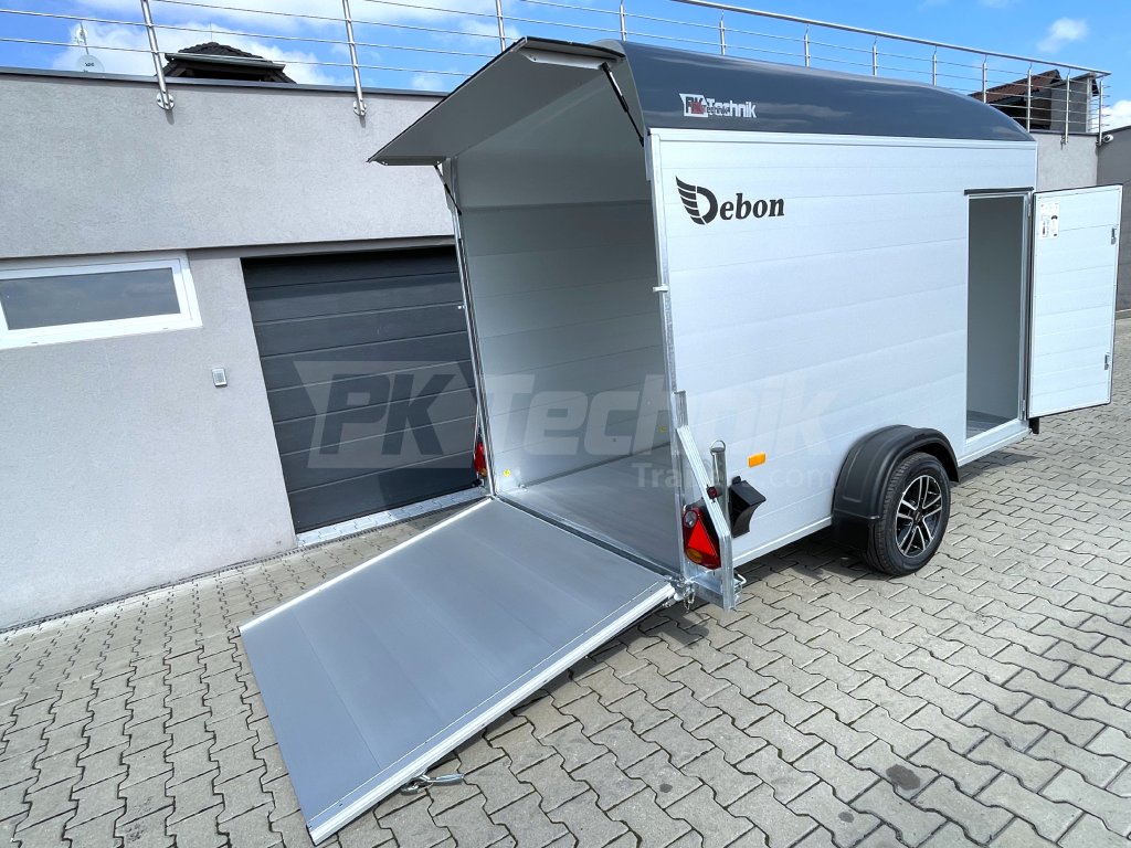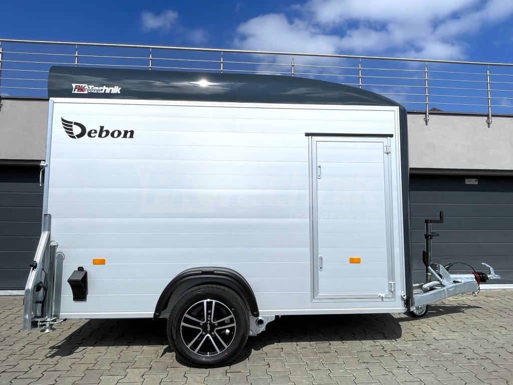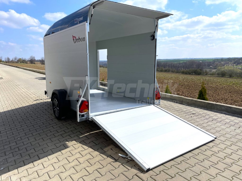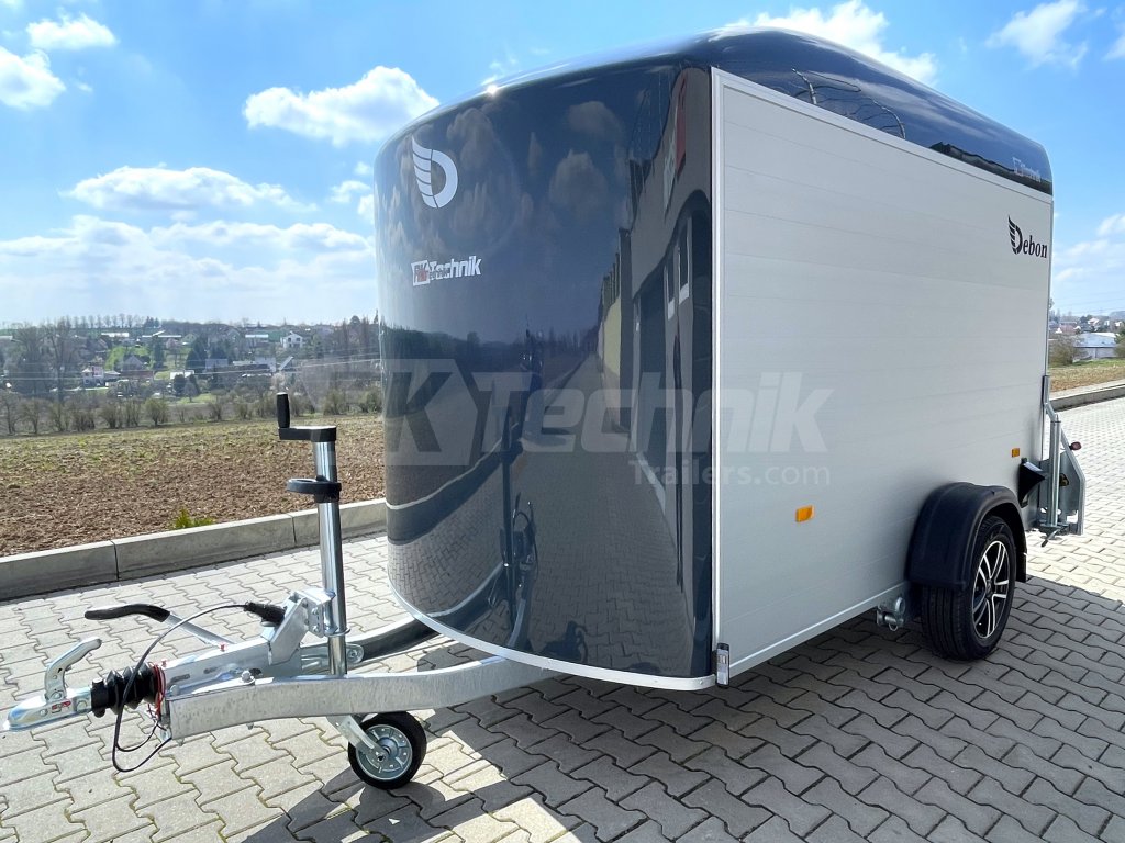 Samozřejmostí je také automatické opěrné kolečko a zadní podpěrné nohy, které umožňují snadné a pohodlné nakládání a vykládání přepravovaného nákladu bez nutnosti připojení přívěsu k vozidlu. Skříňový přívěs Debon C400 má uzamykatelné boční dveře a odolná hliníková kola. Základní celkovou hmotnost přívěsu vám jakožto ministerstvem dopravy oficiálně akreditovaný importér pro ČR můžeme snížit z 1300 kg až na 750 kg.