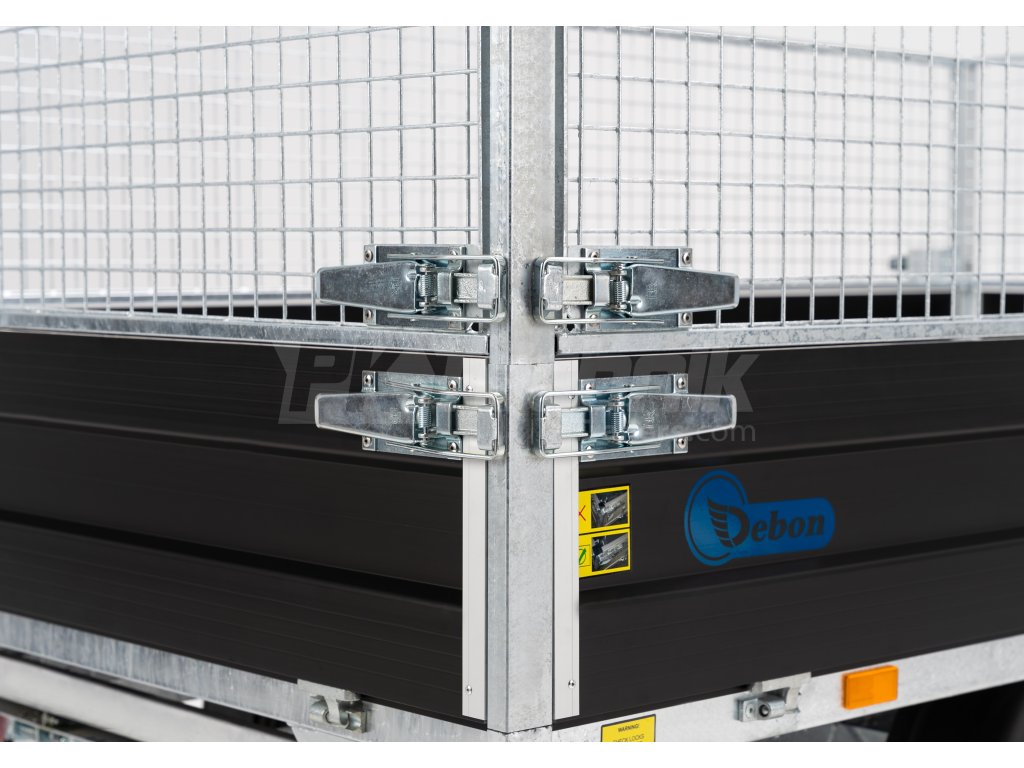 Elektrohydraulicky sklopný valníkový přívěs DEBON PW 3.3 od renomované francouzské společnosti Cheval Liberte - Debon se díky použití nejmodernějších technologií při výrobě vyznačuje univerzálním využitím a vysokou odolností. Je vybaven vestavěným akumulátorem pro nezávislé sklápění nástavby, aniž by bylo nutné přívěs připojit ke zdroji elektrické energie, a tento model, Debon PW 3.3 je také navíc dovybaven manuální (ruční) pumpou, pro případné "nouzové" zvedání nákladového prostoru, nástavby. Přívěs je konstruován na ocelovém pozinkovaném rámu, který je vyráběn nejmodernějšími CNC stroji, osazen nápravami německé společnosti KNOTT, černými odnímatelnými bočnicemi z eloxovaných hliníkových profilů EUROLOCK, které lze ze všech stran kompletně odmontovat včetně sloupků, a vytvořit tak rovné plato pro převoz nejrůznějších nákladů. Podlaha ložné plochy přívěsu je chráněna pozinkovaným plechem pro ještě delší životnost a celkovou odolnost. Do ložné plochy je standartně instalováno 8 kotevních třmenů, pro zajištění přepravovaného nákladu. Přívěs je velmi vhodný pro přepravu nejrůznějších materiálů, včetně sypkých, nebo stavební či zahradní mechanizace, jako jsou bagry, traktory, čtyřkolek apod.