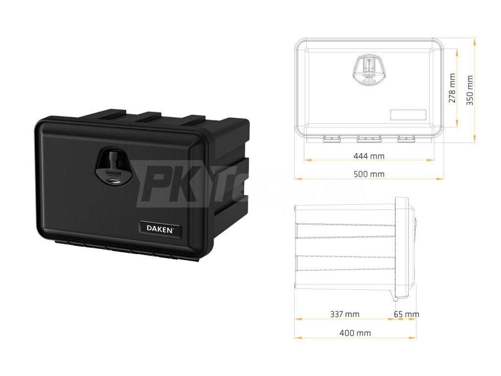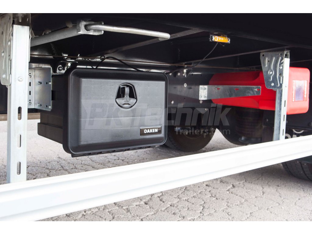 Schránka na příslušenství DAKEN JUST 500 je efektivním řešením pro současné požadavky na vybavení užitkových vozidel a přívěsů. Výborná kvalita materiálů, důraz na detail a design dělají z boxu JUST 500 základní příslušenství každého přívěsu. Zpracovaná struktura těsnění boxů, zajišťuje prachu i vodě vzdornost. Materiál vyráběný ze surovin (bez přídavku recyklátů) zajišťuje vysokou odolnost proti UV záření, olejům, palivům, vysokým i nízkým teplotám a zároveň je nehořlavý. Box DAKEN JUST 500 je primárně určený k montáži v poloze s uzavřeným víkem svisle (např. na bok pod ložnou plochu vozidla). Boxy řady JUST jsou homologovány jako ochrany proti podjetí (E11 73R-011168). Oproti produktu JUST 500-R má JUST 500 větší hloubku. Díky jeho kompaktním rozměrům stačí k uzavření jeden otočný uzávěr, který je opatřen zámkem s plastovou krytkou.