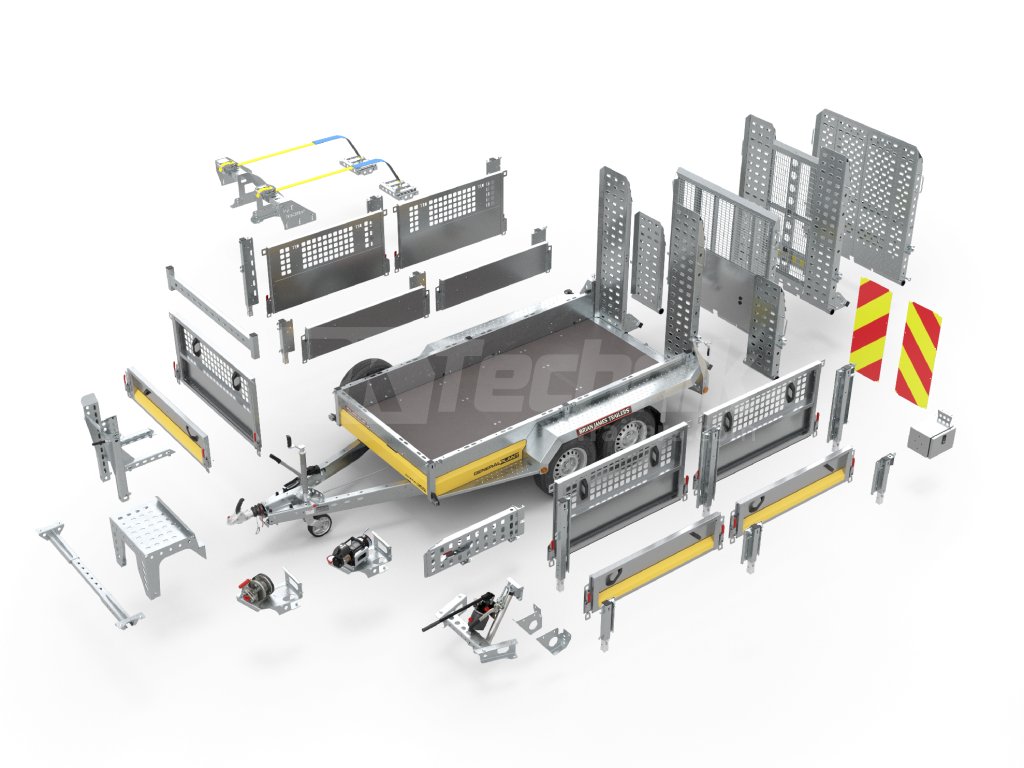 Přívěs je schopen přepravit těžké stroje, což zajišťuje jeho všestrannost a efektivitu v různých aplikacích. Je vyroben z kvalitních materiálů, které garantují dlouhou životnost a odolnost vůči opotřebení. Umožňuje snadné nakládání a vykládání díky praktickému designu, který zahrnuje sklápěcí rampy a nízkou podlahu. Bezpečnostní prvky, jako jsou robustní zajišťovací systémy, chrání náklad během přepravy.