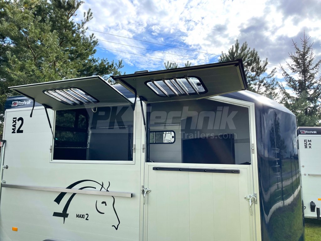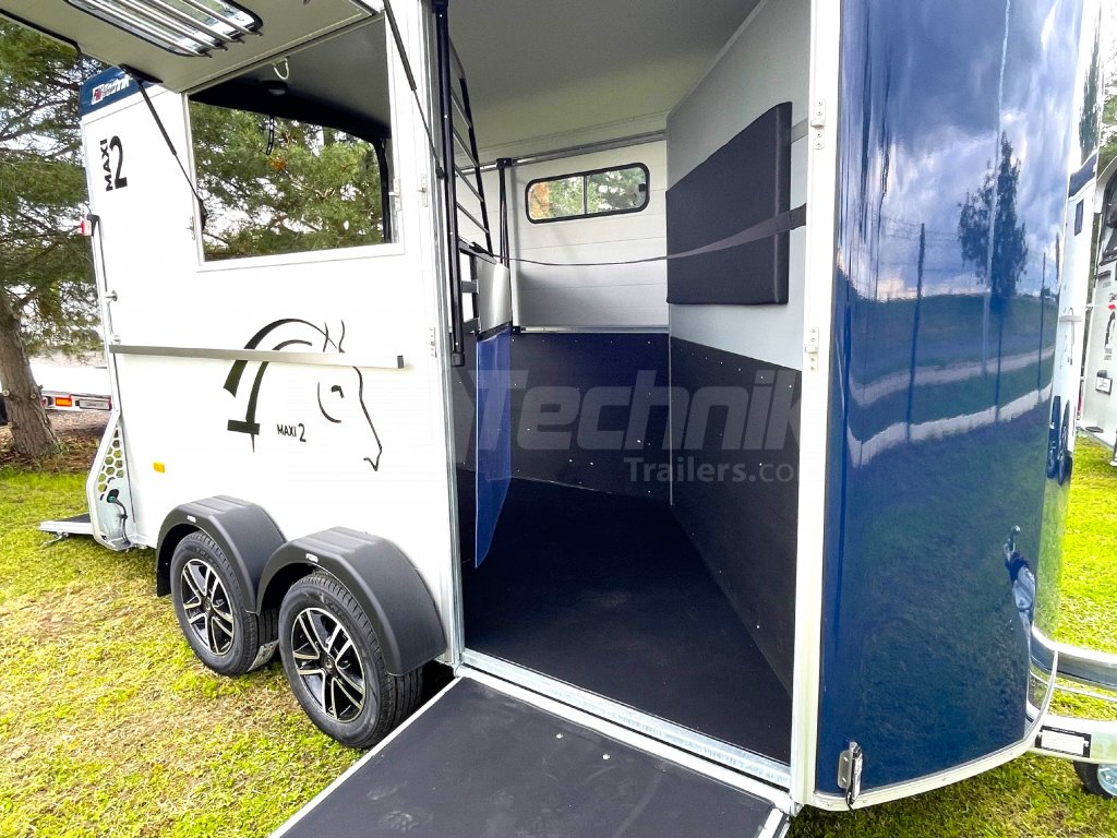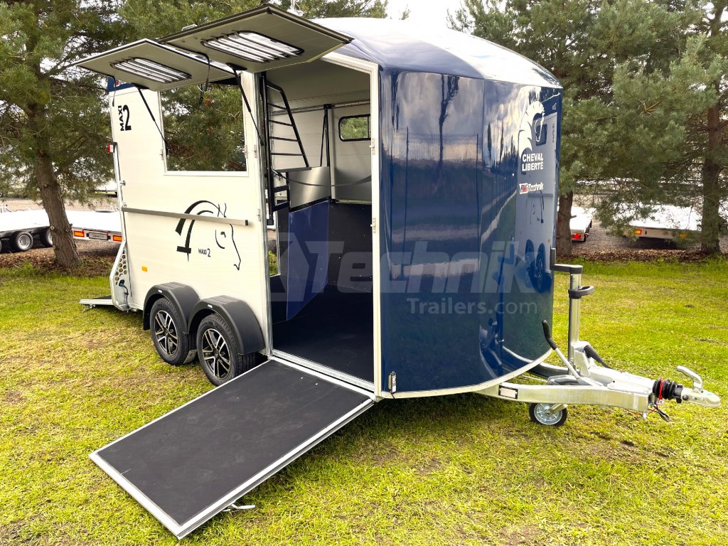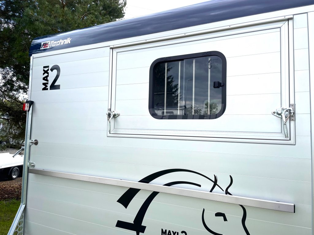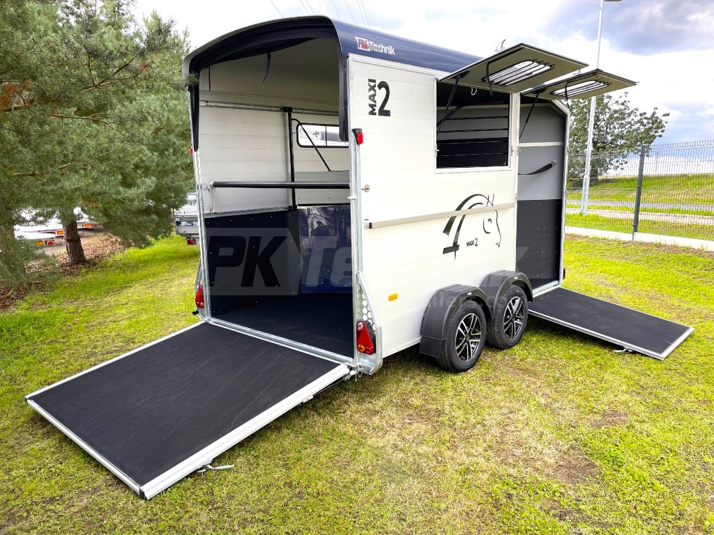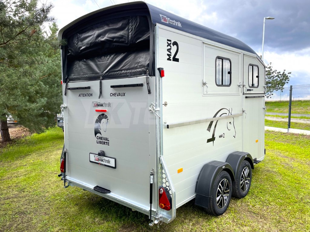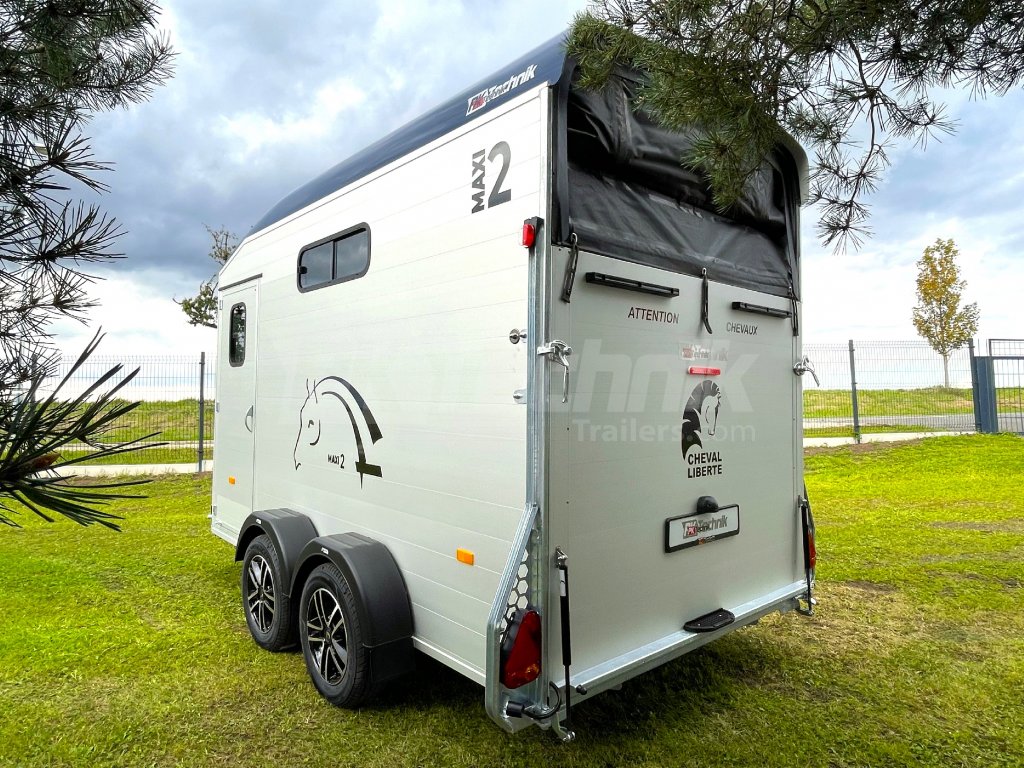 Přívěs Cheval Liberté MAXI 2 od renomovaného francouzského výrobce Cheval Liberté je určený pro ty, kteří hledají velký přívěs pro bezpečnou přepravu dvou velkých koní v šikmém stání. Komfortní snížený podvozek Pullman 2 s nezávislými rameny, pružinami a tlumiči již ve standardní výbavě posouvá přívěs kvalitativně mezi špičku ve své kategorii. Ochrana hlavního ocelového rámu proti korozi je zajištěna žárovým zinkováním. Boční stěny a podlaha přívěsu z hliníkových panelů, střešní a přední část z monoblokového 5-ti vrstvého laminátu o tloušťce 8 mm s integrovanými ocelovými výztuhami, zajišťují nízkou provozní hmotnost, dokonalý komfort při přepravě a také dlouhou životnost přívěsu. Mezi přednosti modelů MAXI patří charakteristická širší a nižší přední vykládací rampa, která výrazně usnadňuje výstup koní, pro které je obtížné vycházet z přívěsu pozadu.