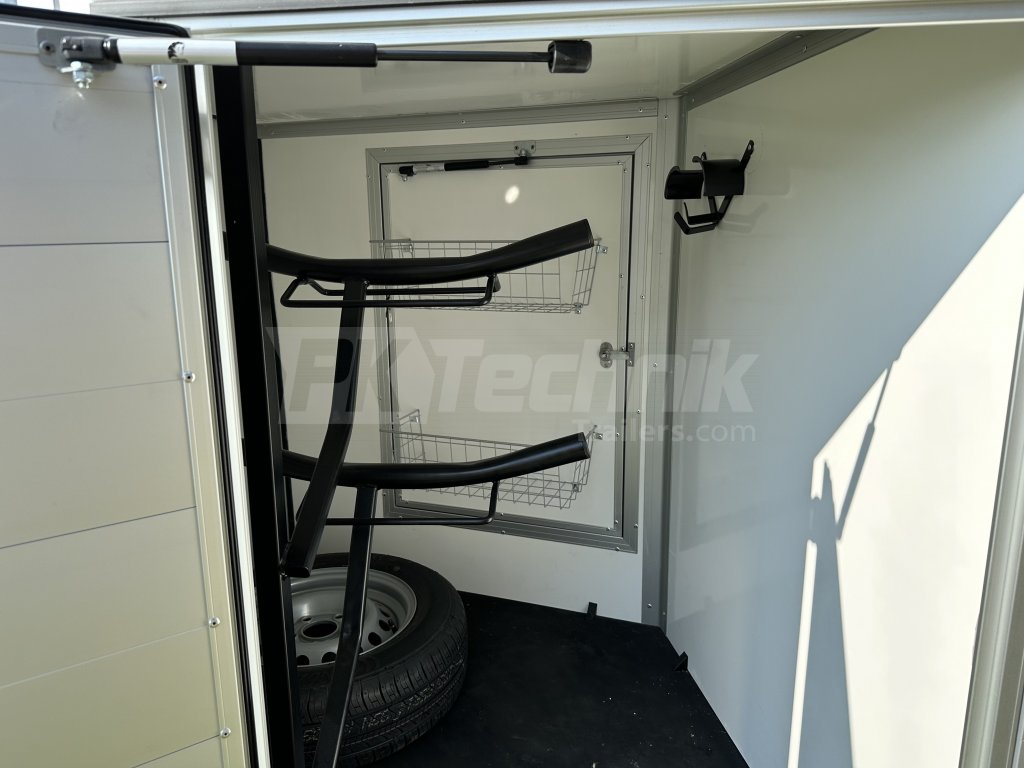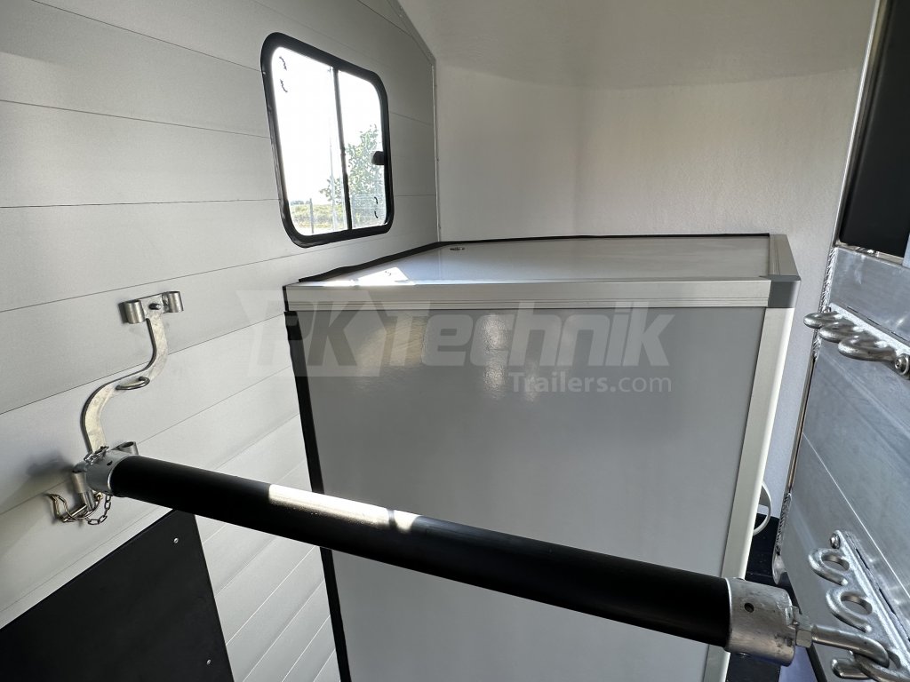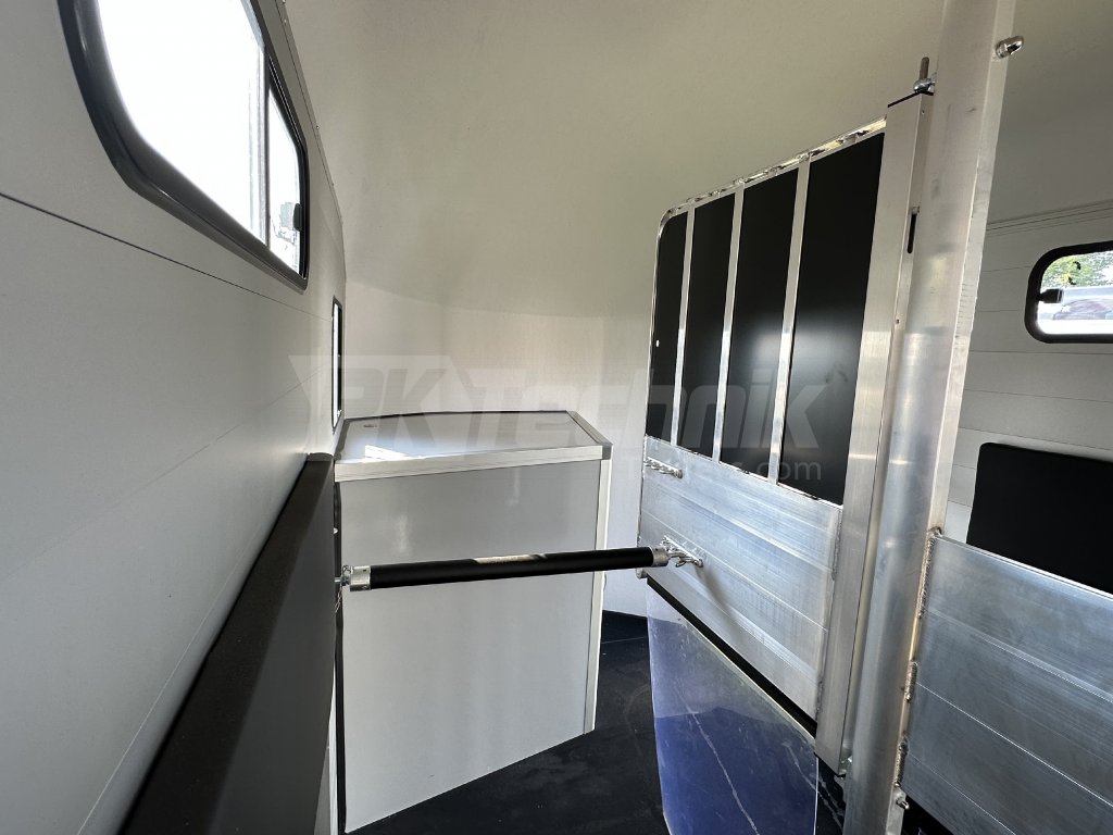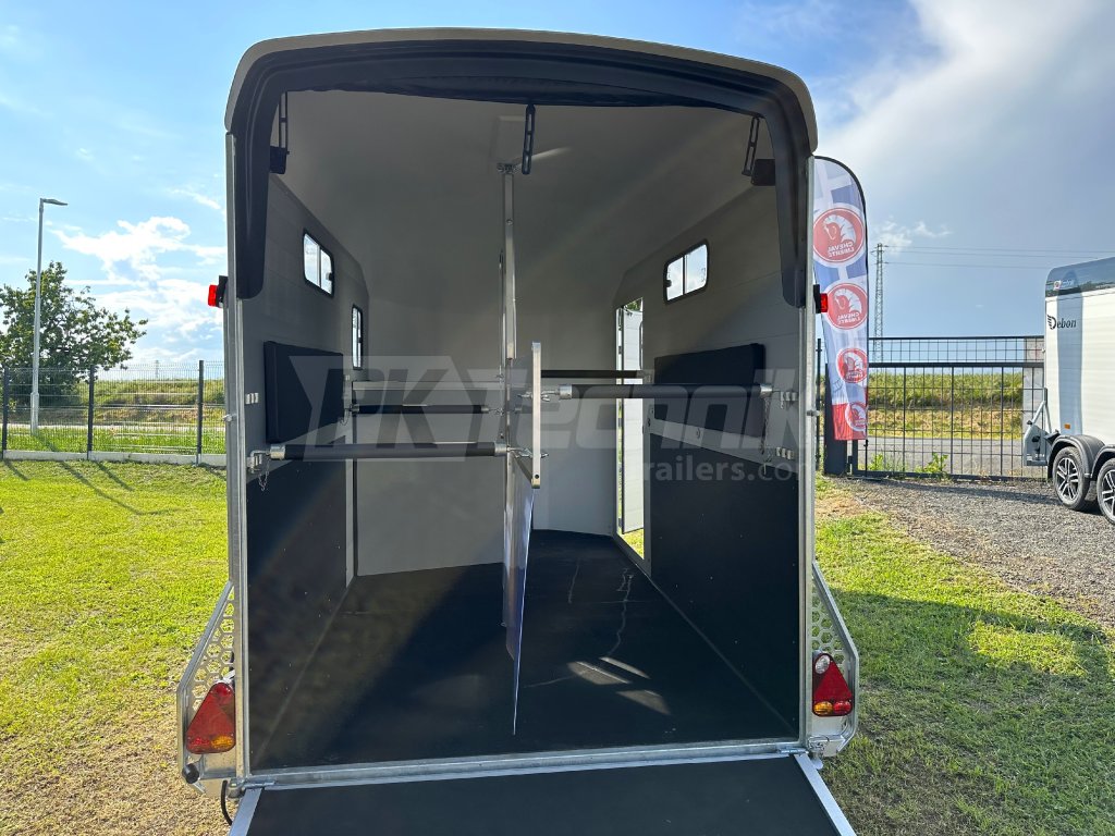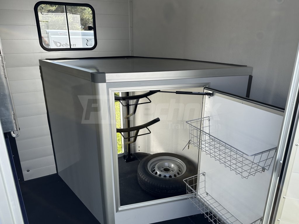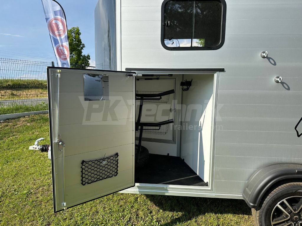 Ve standardní výbavě je velká prostorná sedlovna s posuvnou přepážkou po celé šíři a výši přívěsu nebo malá skříňová sedlovna, která nabízí více vnitřního prostoru pro koně a je přístupná venkovními bočními dveřmi na levé straně přívěsu nebo obslužnými vnitřními dvířky. Oba typy sedloven jsou vybaveny držáky sedel a uzdeček. Základní celkovou hmotnost přívěsu vám, jako akreditovaný importér pro ČR schválený ministerstvem dopravy, můžeme snížit z 2600 kg až na 1400 kg.