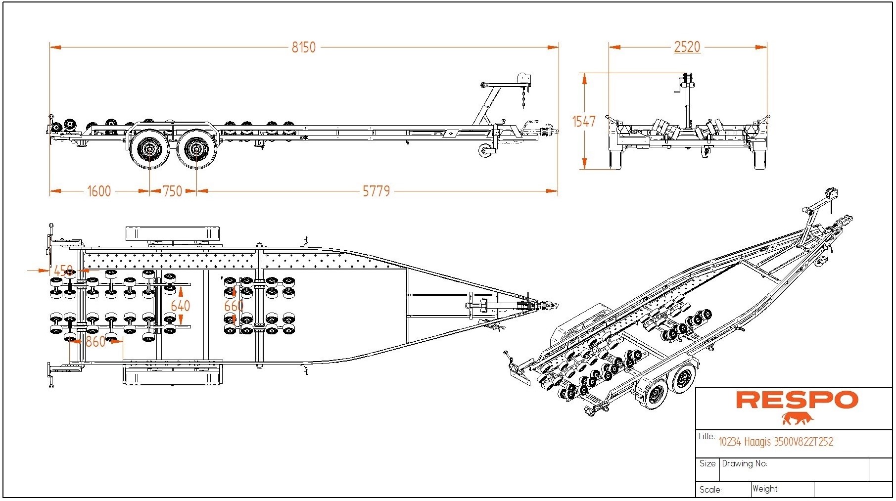 Vysoce odolný, bržděný, víceválcový přepravník lodí RESPO 3500V822 Multiroller. Samoregulační systém 44 válců zajišťuje plynulé a bezpečné nakládání i vykládání lodi. Přívěs RESPO V802 žárově zinkovaným rámem, odolnými stupňovitými blatníky s povrchovou úpravou Magnelis®, boční pochozí zinkovanou lávkou, je osazen dvěma nastavitelnými torzními nápravami. Manuální naviják s bezpečnostním řetězem umožňuje snadné naložení i vyložení přepravované lodi. Stojan pro manuální naviják s popruhem a bezpečnostním řetězem je nastavitelný vodorovně i svisle, usnadní tak manipulaci. Díky absenci kýlových válečků je vhodný i pro lodě s nestandardním dnem.