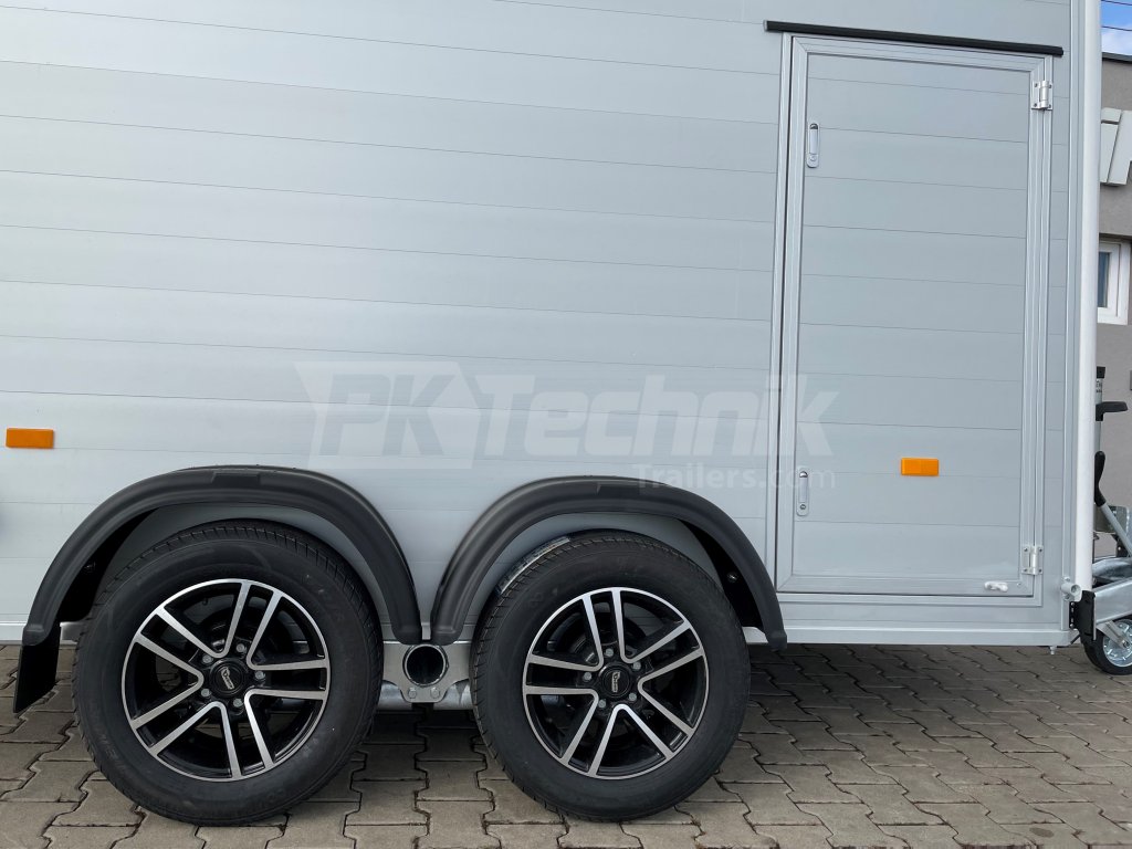Samozřejmostí je také automatické opěrné kolečko a zadní podpěrné nohy, které umožňují snadné a pohodlné nakládání a vykládání přepravovaného nákladu bez nutnosti připojení přívěsu k vozidlu. Skříňový přívěs Debon C500 má uzamykatelné boční dveře a odolná hliníková kola.