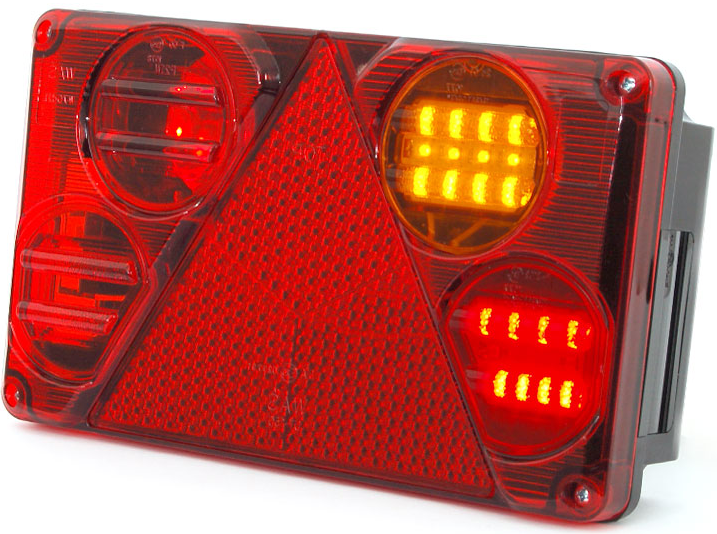 Sdružená LED svítilna značky WAS s integrovaným odrazovým trojúhelníkem, koncovou svítilnou, blinkrem, brzdovou svítilnou a osvětlením SPZ