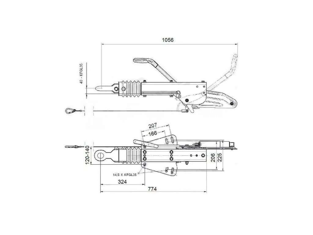 Nájezdová brzda KNOTT KFGL 35-D (GF) je určena pro horní i spodní montáž na oj ve tvaru „ V ". Nájezdová brzda je dodávána kompletní, včetně tažného oka DIN 40 mm.