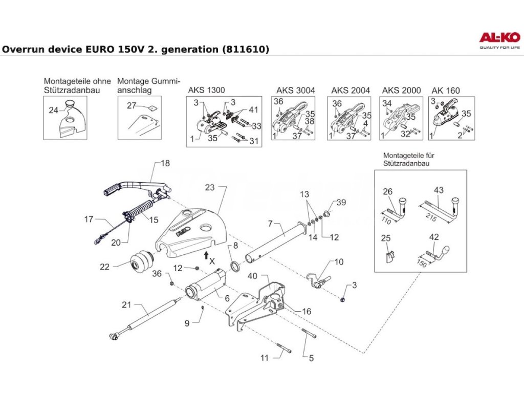 - Futófék AL-KO 150V (AE EURO-2 150V) 2. generáció a AL-KO 1637 (belső dobátmérő 160 mm) és AL-KO 2051 (belső dobátmérő 200 mm) kerékegységgel felszerelt pótkocsikhoz automatikus irányváltással