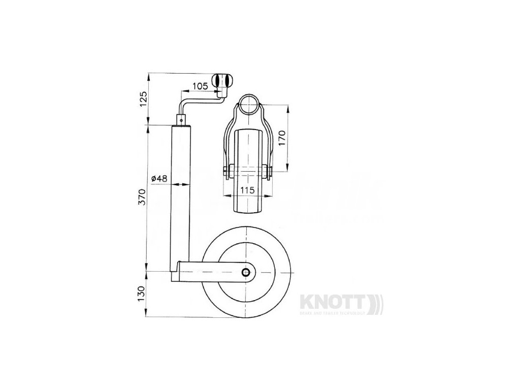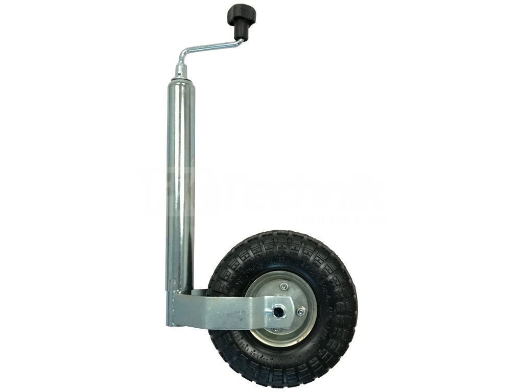 Tartókerék (felfújható) a KNOTT márkájú, 150 kgmaximális teherbírású pótkocsihoz, 48 mm-es csőátmérőjű konzolba szerelve.