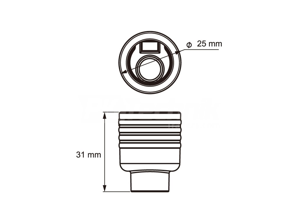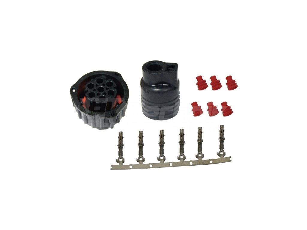 Standardní bajonetový AMP konektor s osazením pro 7 pinů. POZOR! Konektor je určen pro použití na přívěsových sdružených svítilnách, a proto balení zahrnuje pouze šest pinů. Zdířka jednoho pinu zůstává neosazena (pro levou i pravou svítilnu stačí osadit kostru, koncové, brzdové, směrové, mlhové a couvací světlo, tedy pouze šest pinů).
