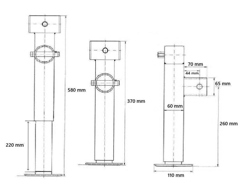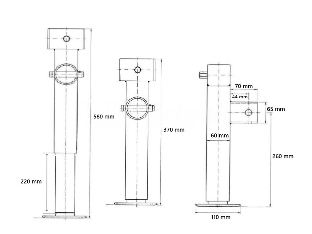 Set originale di gambe di supporto DEBON PW. Set di gambe di supporto KNOTT per rimorchi ribaltabili DEBON PW. La gamba può ruotare liberamente sulla flangia ed essere fissata in posizione verticale o orizzontale tramite un perno di bloccaggio. Ruotando l’esagono da 19 mm, la gamba può essere estesa fino a 220 mm.