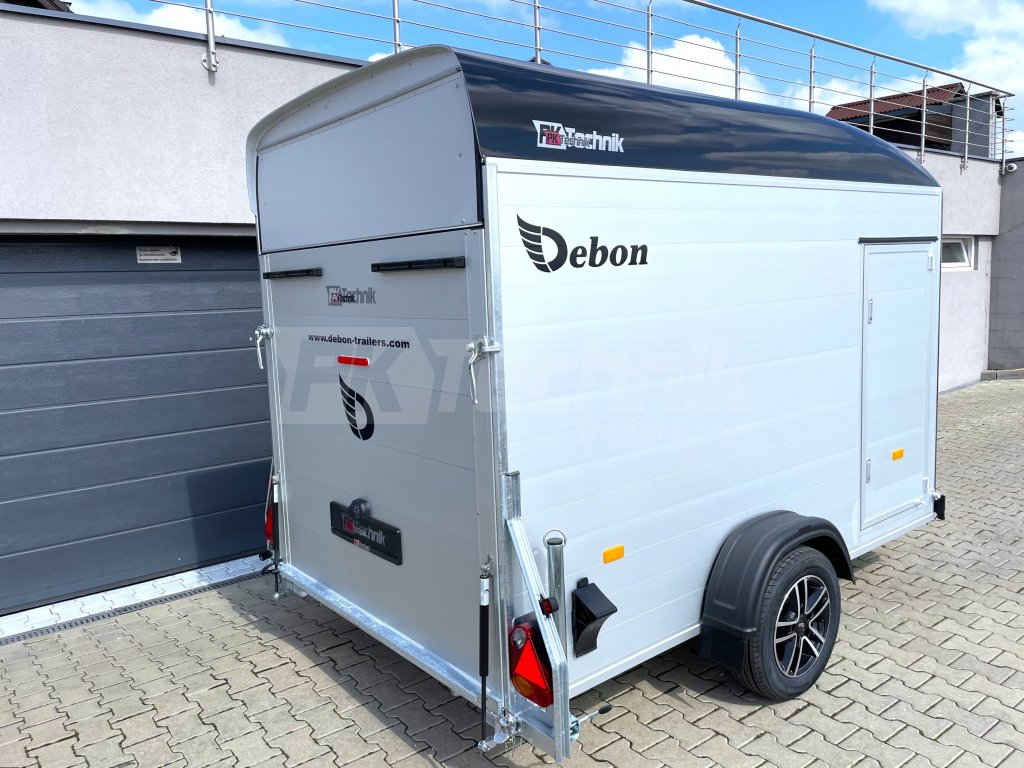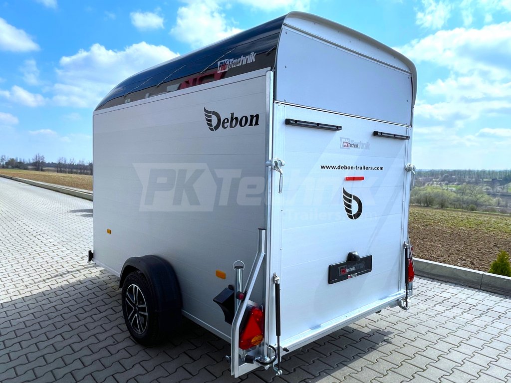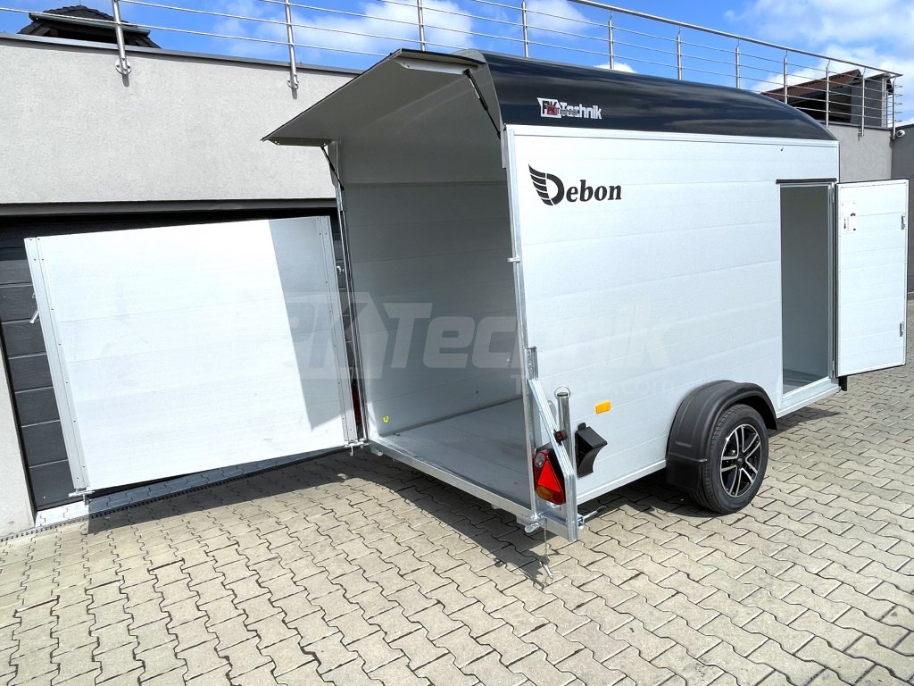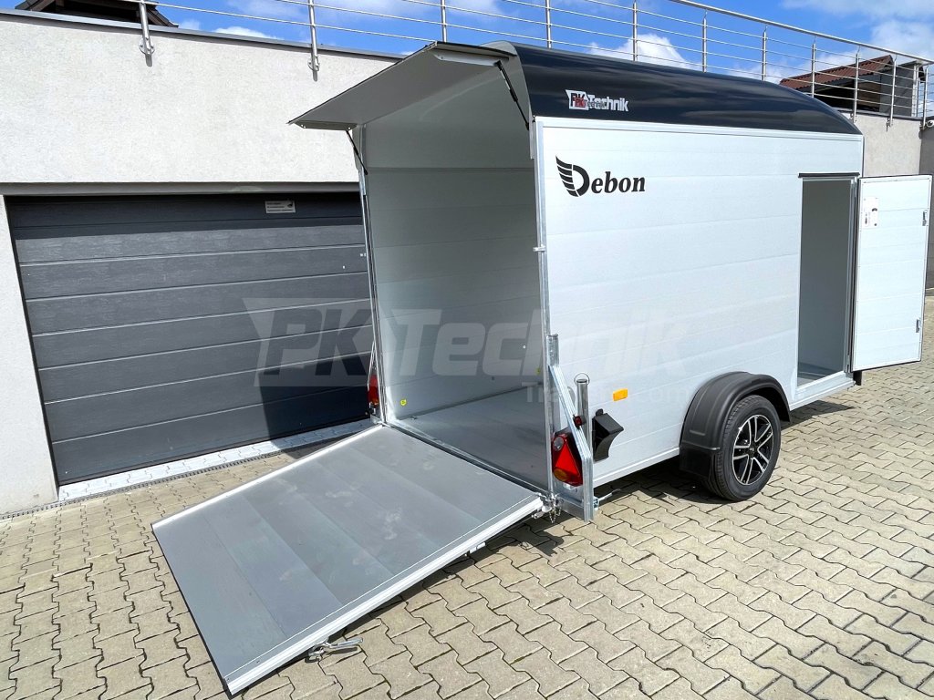 Samozřejmostí je také automatické opěrné kolečko a zadní podpěrné nohy, které umožňují snadné a pohodlné nakládání a vykládání přepravovaného nákladu bez nutnosti připojení přívěsu k vozidlu. Skříňový přívěs Debon C400 má uzamykatelné boční dveře a odolná hliníková kola. Základní celkovou hmotnost přívěsu vám jakožto ministerstvem dopravy oficiálně akreditovaný importér pro ČR můžeme snížit z 1300 kg až na 750 kg.