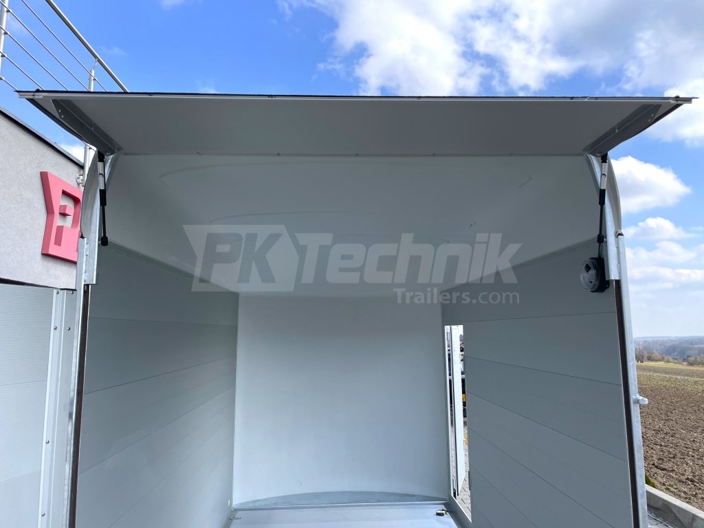 Na bočnice navazuje monobloková laminátová střešní nástavba o tloušťce cca 8 mm, která zajišťuje dokonalou aerodynamiku a tuhost celého přívěsu. Podvozek a rám jsou žárově zinkované, což zajišťuje vysokou odolnost proti korozi.