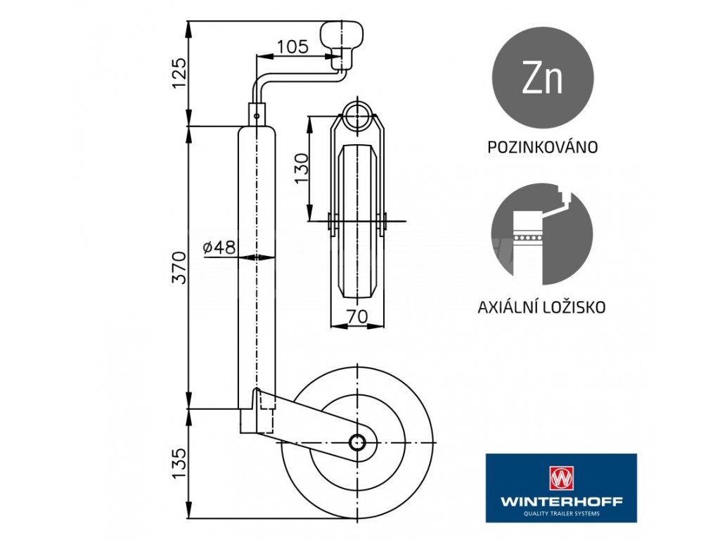 Opěrné kolečko k přívěsu WINTERHOFF s maximální nosností 150 kg, montáž do držáku s průměrem trubky 48 mm.