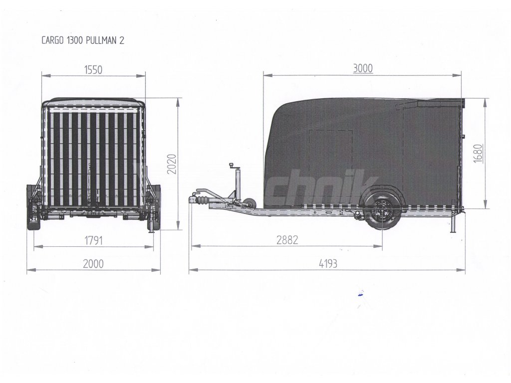 Tento bržděný aerodynamický přívěs má uzamykatelné boční dveře. Základní celkovou hmotnost přívěsu vám jakožto ministerstvem dopravy oficiálně akreditovaný importér pro ČR můžeme snížit z 1300 kg až na 750 kg.