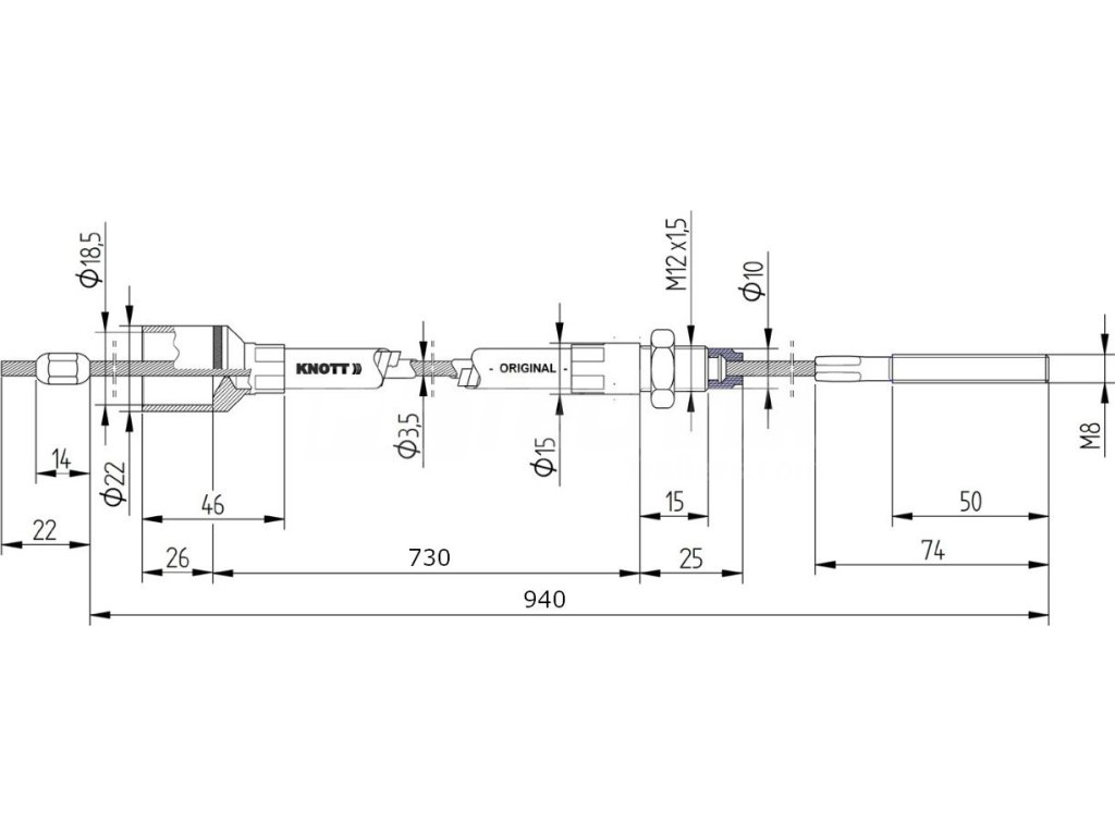 Nerezový brzdový lanovod KNOTT 730/940 mm, závit M8