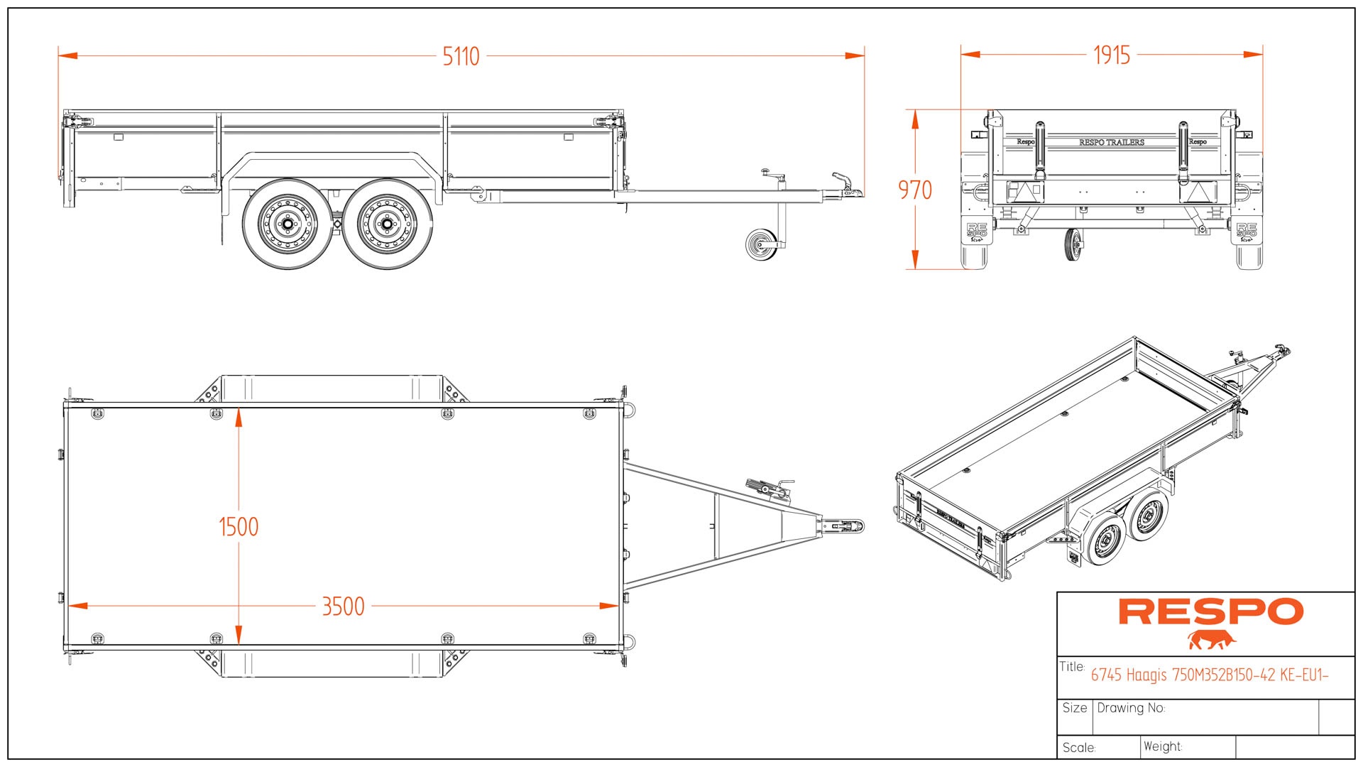 Extrémně odolný, nebrzděný nákladní přívěs RESPO 750M352B150. Přívěs vyniká oproti běžným přívěsným vozíkům především díky robustnímu žárově zinkovanému rámu z "C" profilu, robustní tandemové nápravě s listovým odpružením a tlumiči, která je o mnoho odolnější nežli běžné torzní nápravy, a v neposlední řadě jsou kolové jednotky osazeny voděodolnými ložisky, která se běžně aplikují u přívěsů pro lodě, a mají až 3x delší životnost nežli standardní ložiska. Bočnice přívěsu jsou otevíratelné nejen v zadní, ale také v přední části. Vyrobeny jsou z robustního plechu s povrchovou úpravou Magnelis ®, která je až 3x odolnější proti korozi, díky chemickému složení zinku s příměsemi hliníku a hořčíku.