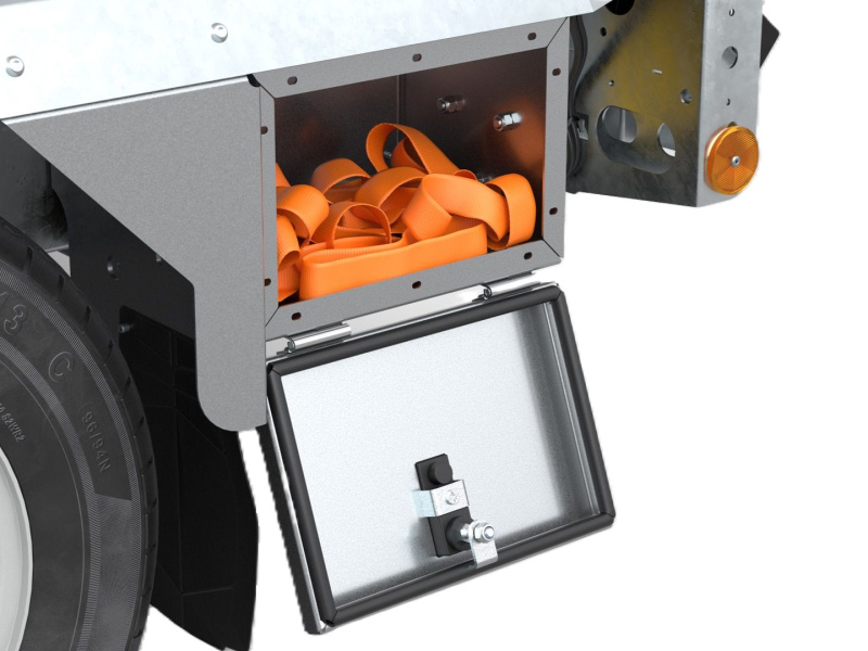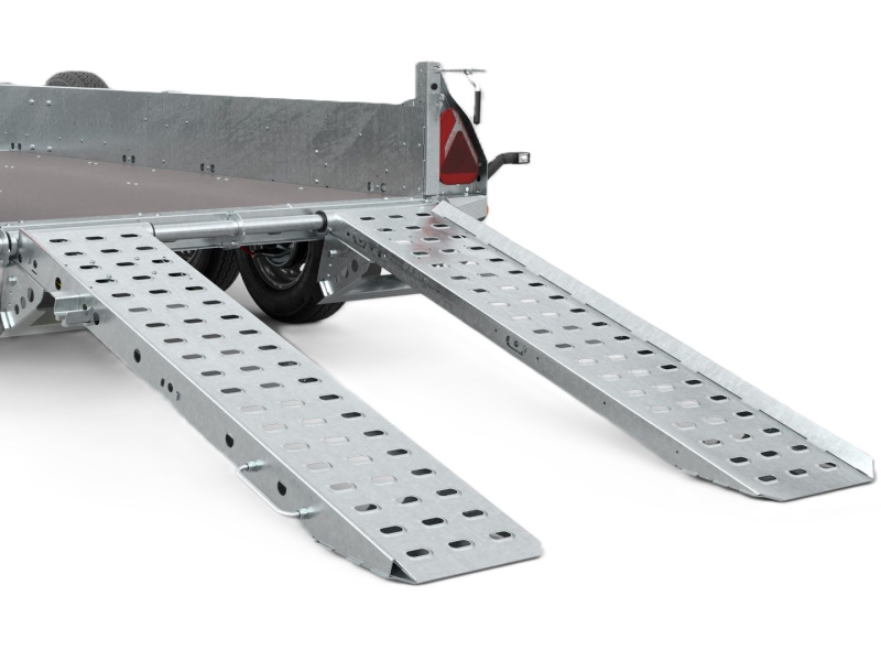 Přívěs je schopen přepravit těžké stroje, což zajišťuje jeho všestrannost a efektivitu v různých aplikacích. Je vyroben z kvalitních materiálů, které garantují dlouhou životnost a odolnost vůči opotřebení. Umožňuje snadné nakládání a vykládání díky praktickému designu, který zahrnuje sklápěcí rampy a nízkou podlahu. Bezpečnostní prvky, jako jsou robustní zajišťovací systémy, chrání náklad během přepravy.
