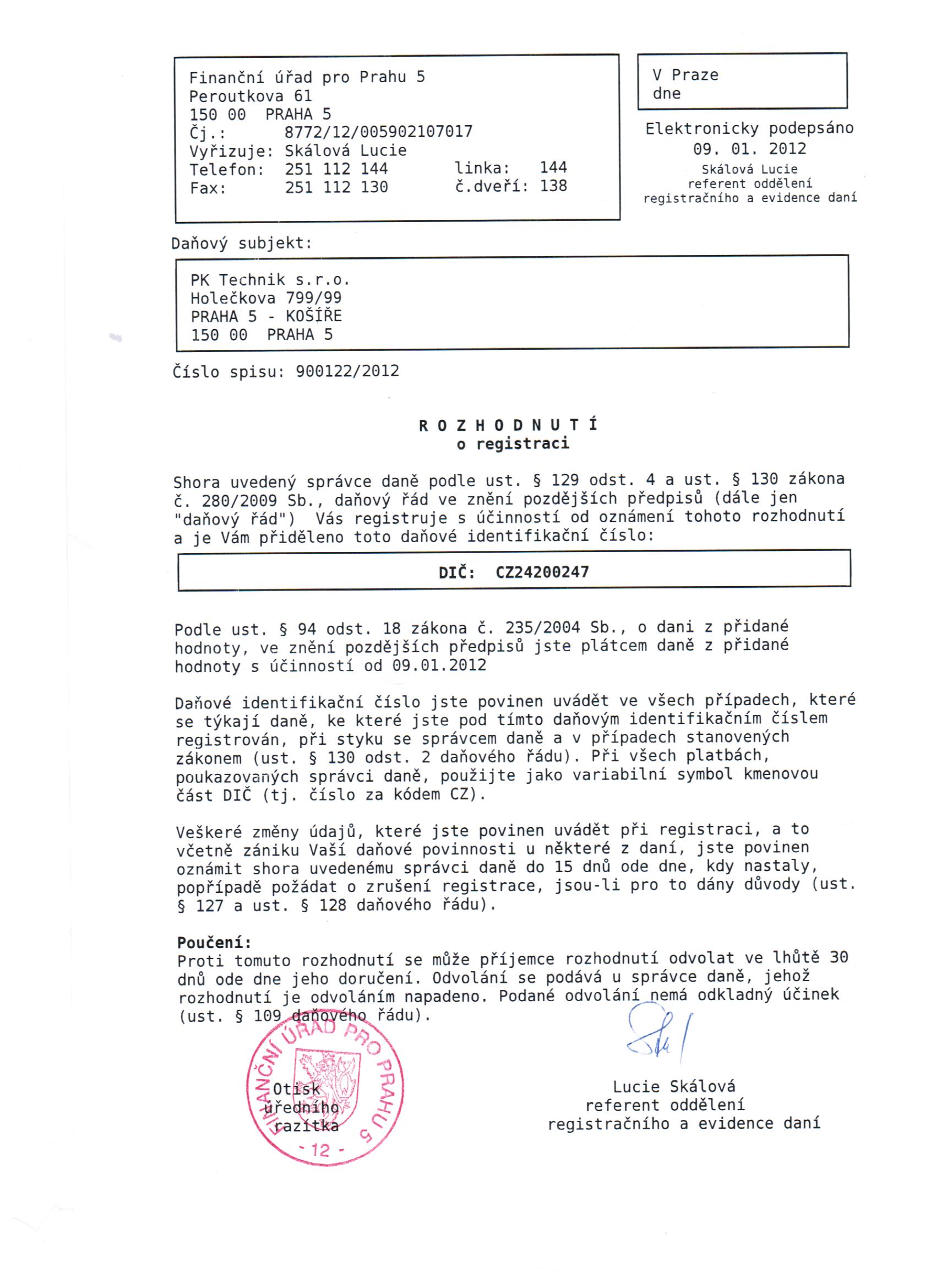 Daňové identifikační číslo: CZ24200247, plátce DPH