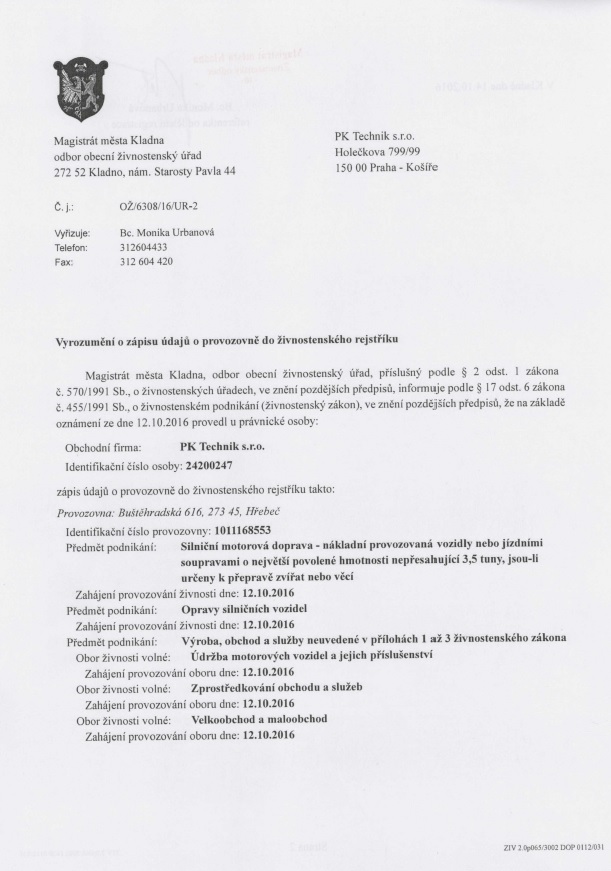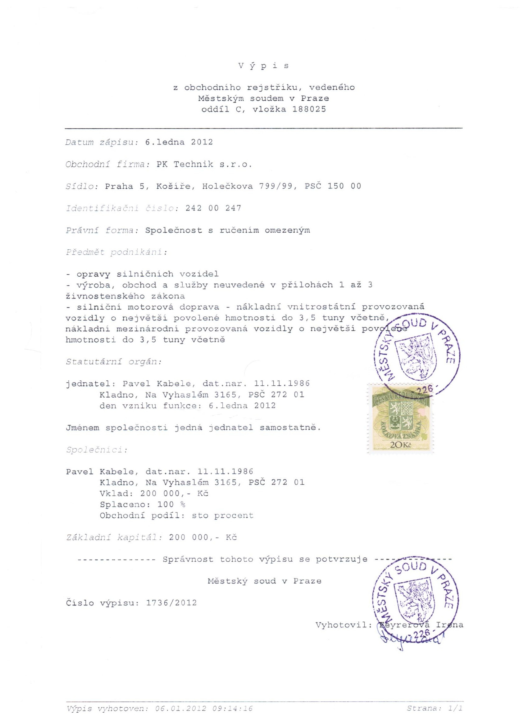 PK Technik s.r.o. , Holečkova 799/99, Praha 5, 150 00. Vedená u Městského soudu v Praze, spisová značka C188025, IČ:24200247, DIČ: CZ24200247.