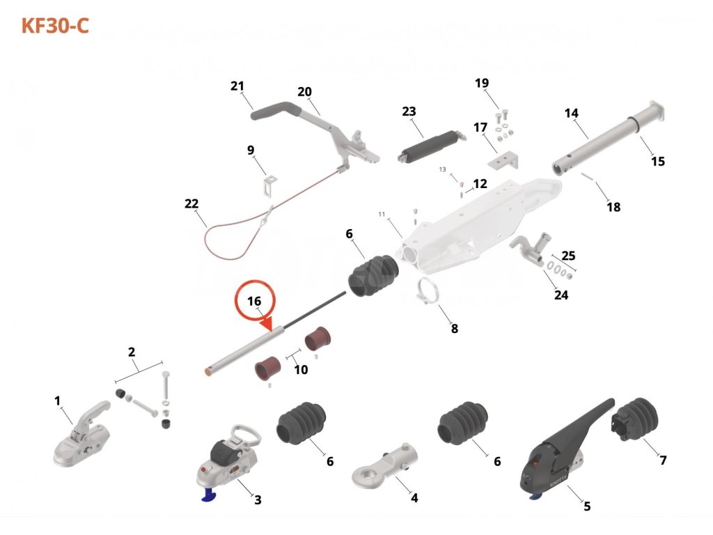 Tłumik hamulca najazdowego KNOTT KF 30 Ausf. C (dla maksymalnej dopuszczalnej masy przyczepy 3000 kg). Długość amortyzatora 670 mm (środek oka - gwint conez M10). Amortyzator gazowo-cieczowy dwustronnego działania jest umieszczony w rurze oporowej hamulca rampowego. Zapewnia płynne narastanie siły hamowania i płynne hamowanie przyczepy. Zużyty lub uszkodzony amortyzator powoduje wstrząsy przyczepy podczas hamowania lub ruszania.Parametry dodatkowe