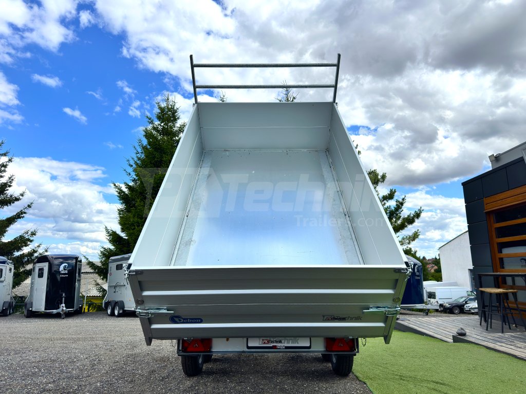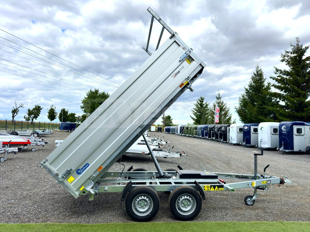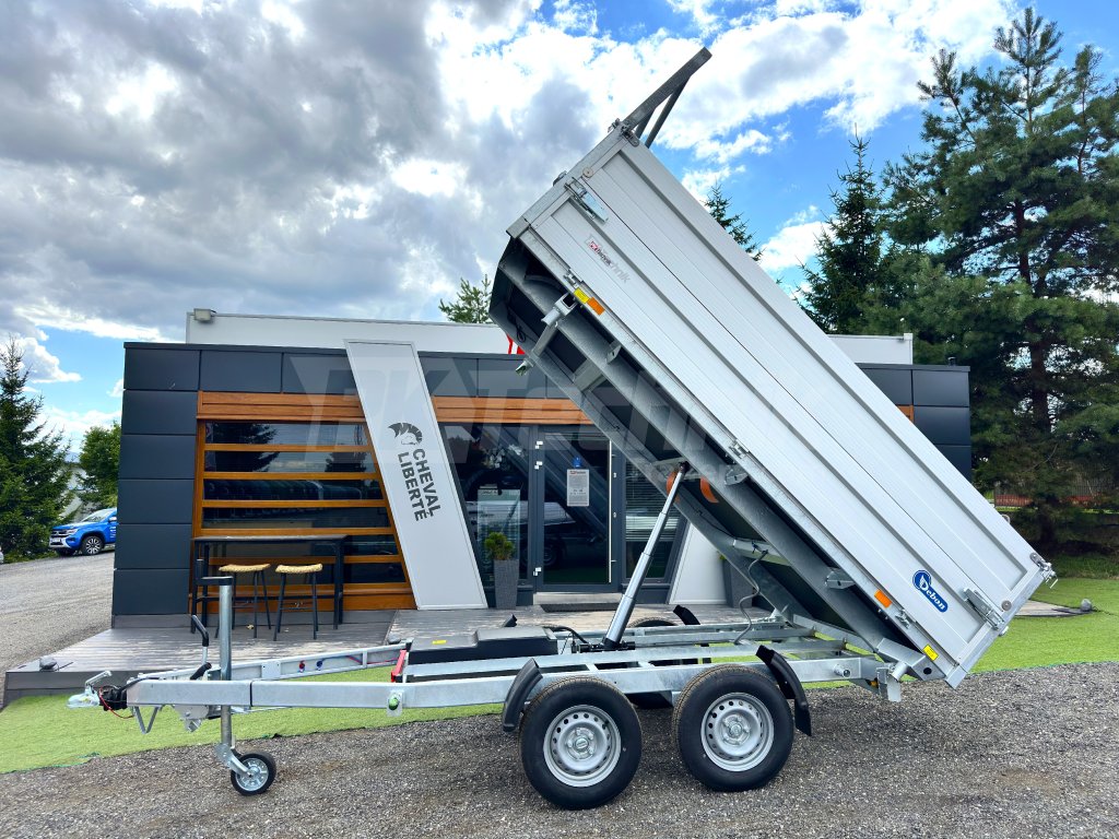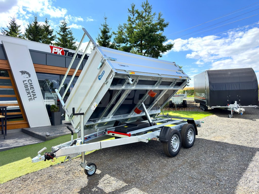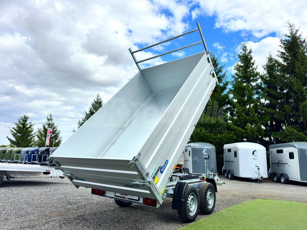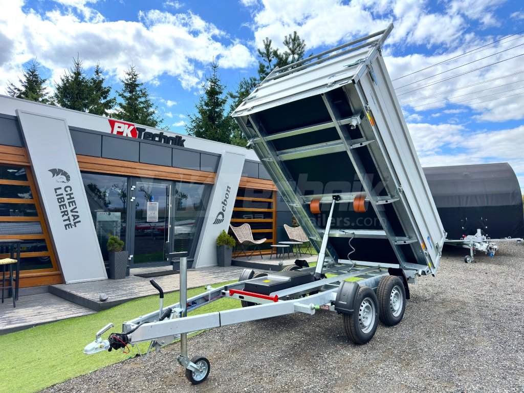 Hydraulicznie składana 3-stronna uniwersalna przyczepa płaska 300x180x35cm wiodącej francuskiej firmy Cheval Liberté Debon TIPPER PW 2.4 LUX z wbudowanym akumulatorem do niezależnego przechylania nadwozia, bez konieczności podłączania do źródła zasilania. Wysoka jakość wykonania do codziennego, profesjonalnego użytku. Przyczepa zbudowana jest na ramie ze stali ocynkowanej, wyposażona w osie niemieckiej firmy KNOTT oraz zdejmowane burty wykonane z anodowanych profili aluminiowych EUROLOCK, które są składane ze wszystkich stron i łatwo zdejmowane. Ponadto, dzięki możliwości demontażu nie tylko wszystkich ścian bocznych, ale także wszystkich słupków, naczepę można przekształcić w płaską platformę do transportu szerokiej gamy ładunków. Podłoga nadbudowy wykonana jest z wodoodpornej sklejki przyczepowej, pokrytej ocynkowaną blachą dla jeszcze dłuższej żywotności i ogólnej trwałości przyczepy. Przestrzeń ładunkowa jest wyposażona w 8 zaczepów do mocowania przewożonego ładunku. Wysokiej jakości przetwarzanie z najnowszą technologią do codziennego użytku profesjonalnego.