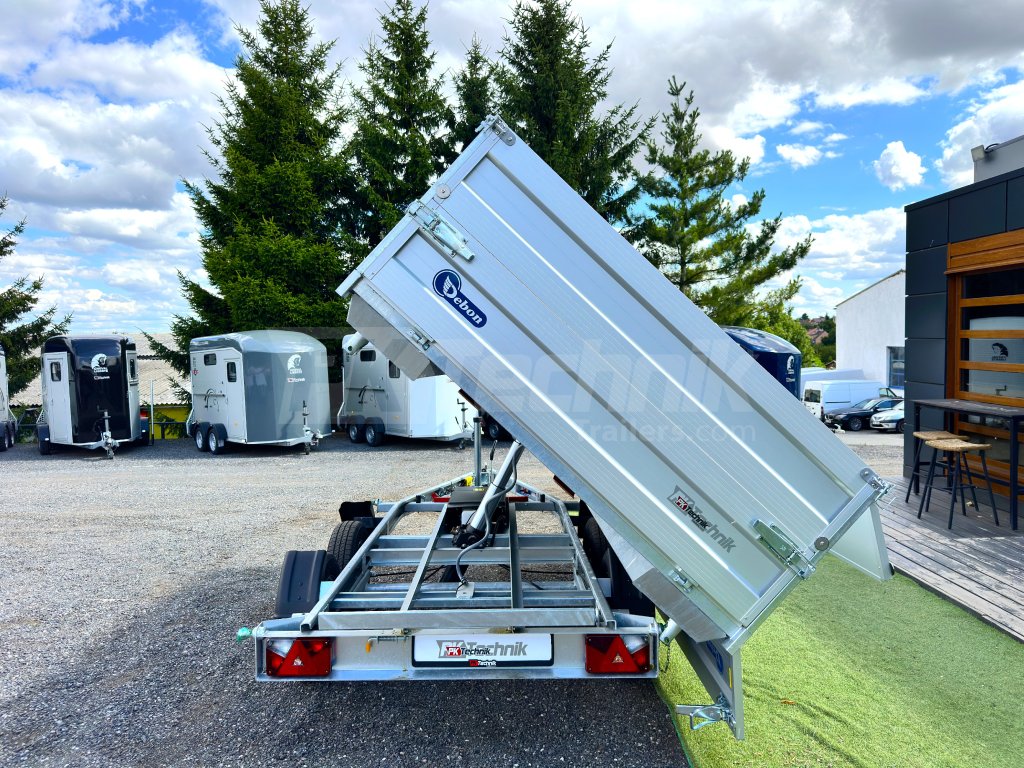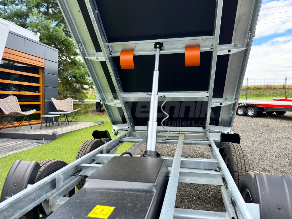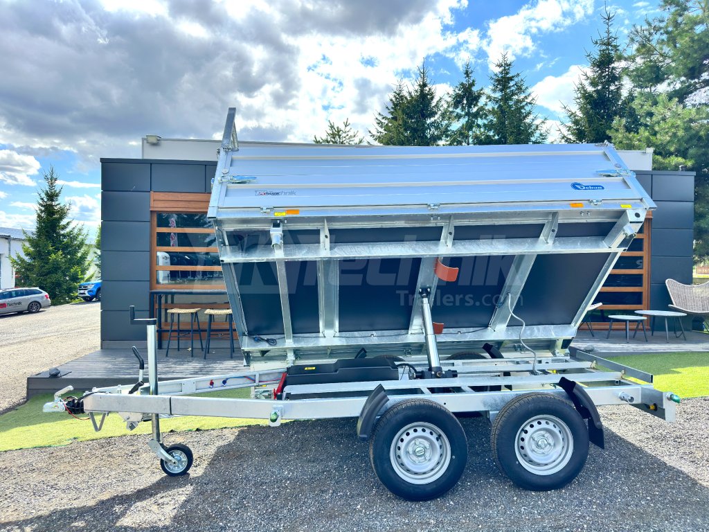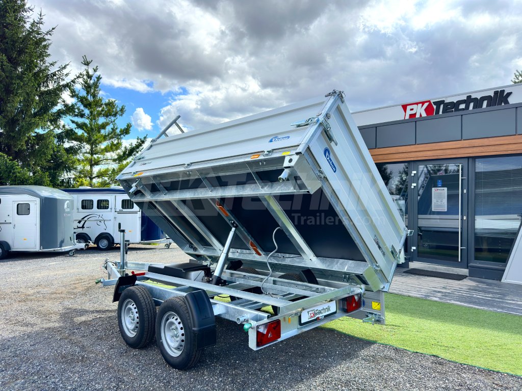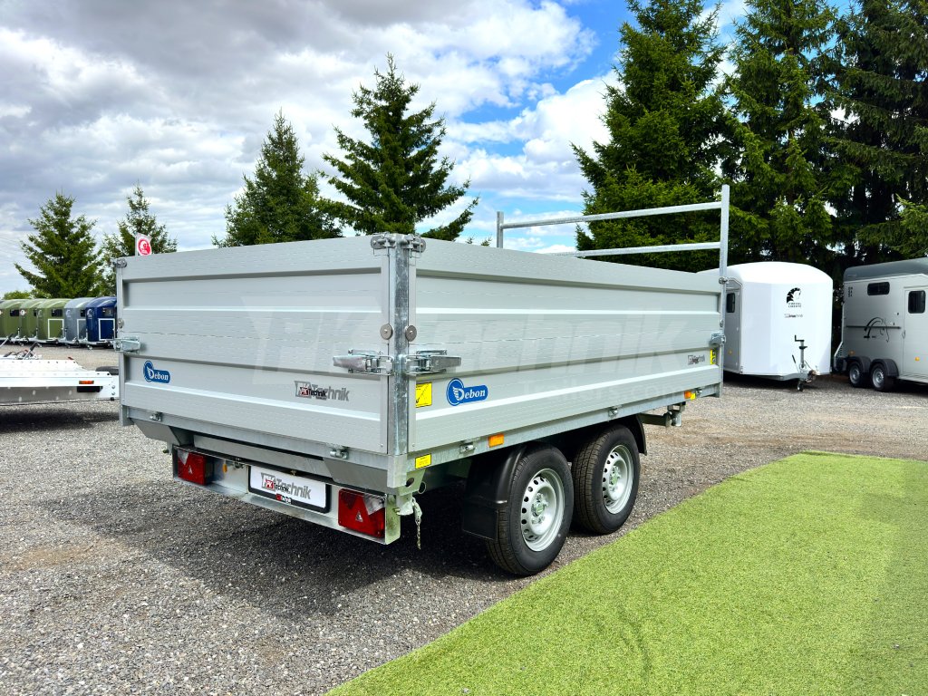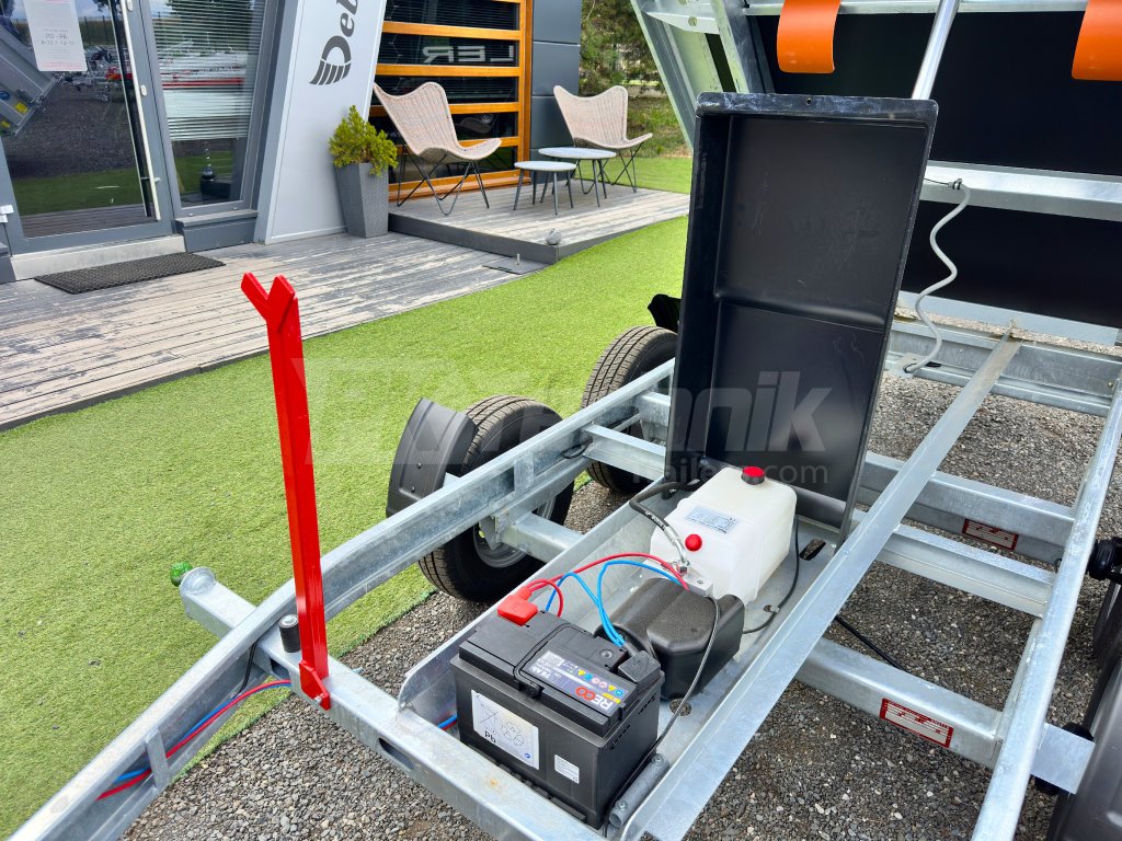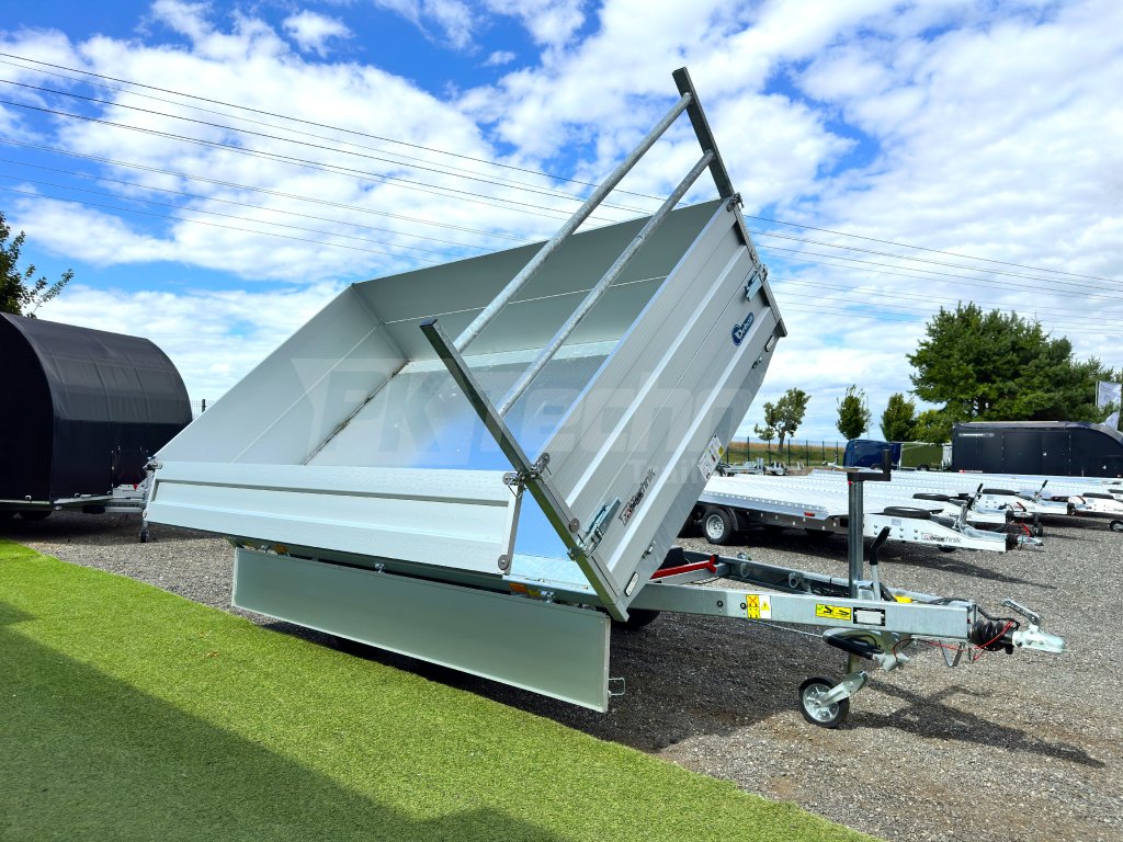 Hydraulicznie składana 3-stronna uniwersalna przyczepa płaska 300x180x35cm wiodącej francuskiej firmy Cheval Liberté Debon TIPPER PW 2.4 LUX z wbudowanym akumulatorem do niezależnego przechylania nadwozia, bez konieczności podłączania do źródła zasilania. Wysoka jakość wykonania do codziennego, profesjonalnego użytku. Przyczepa zbudowana jest na ramie ze stali ocynkowanej, wyposażona w osie niemieckiej firmy KNOTT oraz zdejmowane burty wykonane z anodowanych profili aluminiowych EUROLOCK, które są składane ze wszystkich stron i łatwo zdejmowane. Ponadto, dzięki możliwości demontażu nie tylko wszystkich ścian bocznych, ale także wszystkich słupków, naczepę można przekształcić w płaską platformę do transportu szerokiej gamy ładunków. Podłoga nadbudowy wykonana jest z wodoodpornej sklejki przyczepowej, pokrytej ocynkowaną blachą dla jeszcze dłuższej żywotności i ogólnej trwałości przyczepy. Przestrzeń ładunkowa jest wyposażona w 8 zaczepów do mocowania przewożonego ładunku. Wysokiej jakości przetwarzanie z najnowszą technologią do codziennego użytku profesjonalnego.