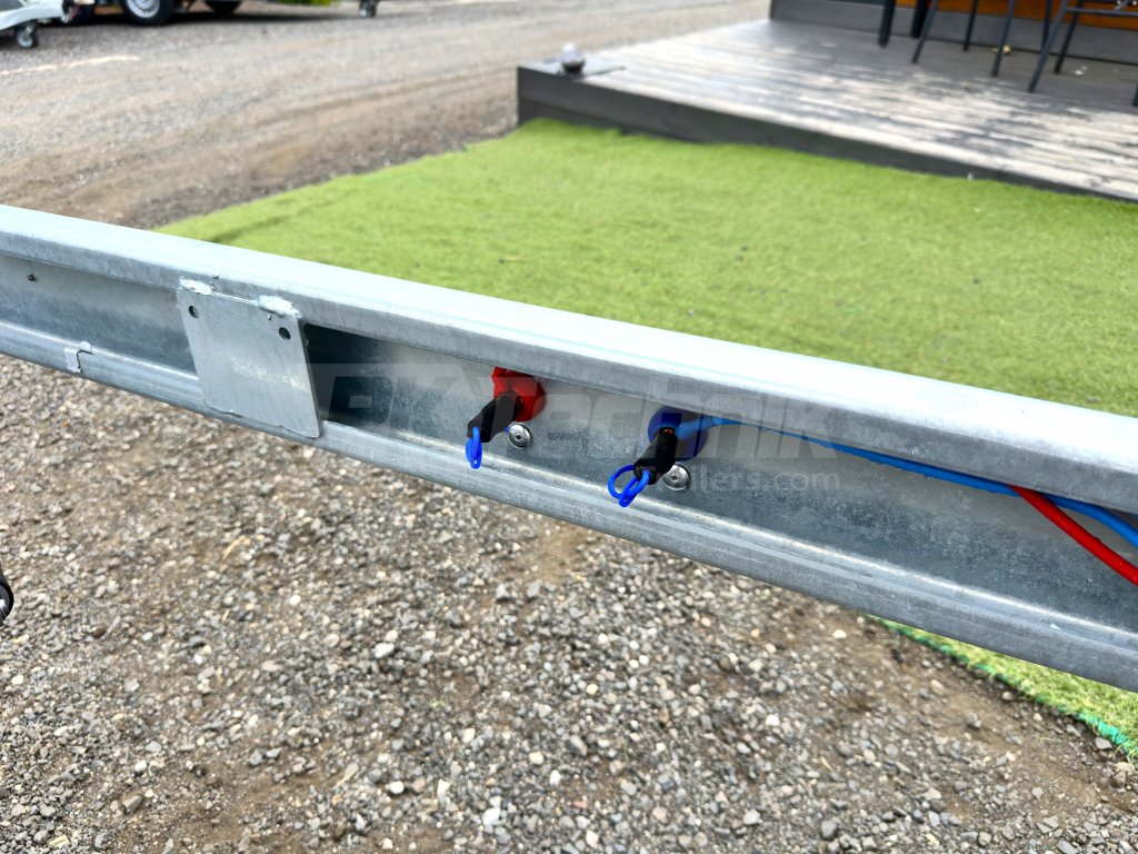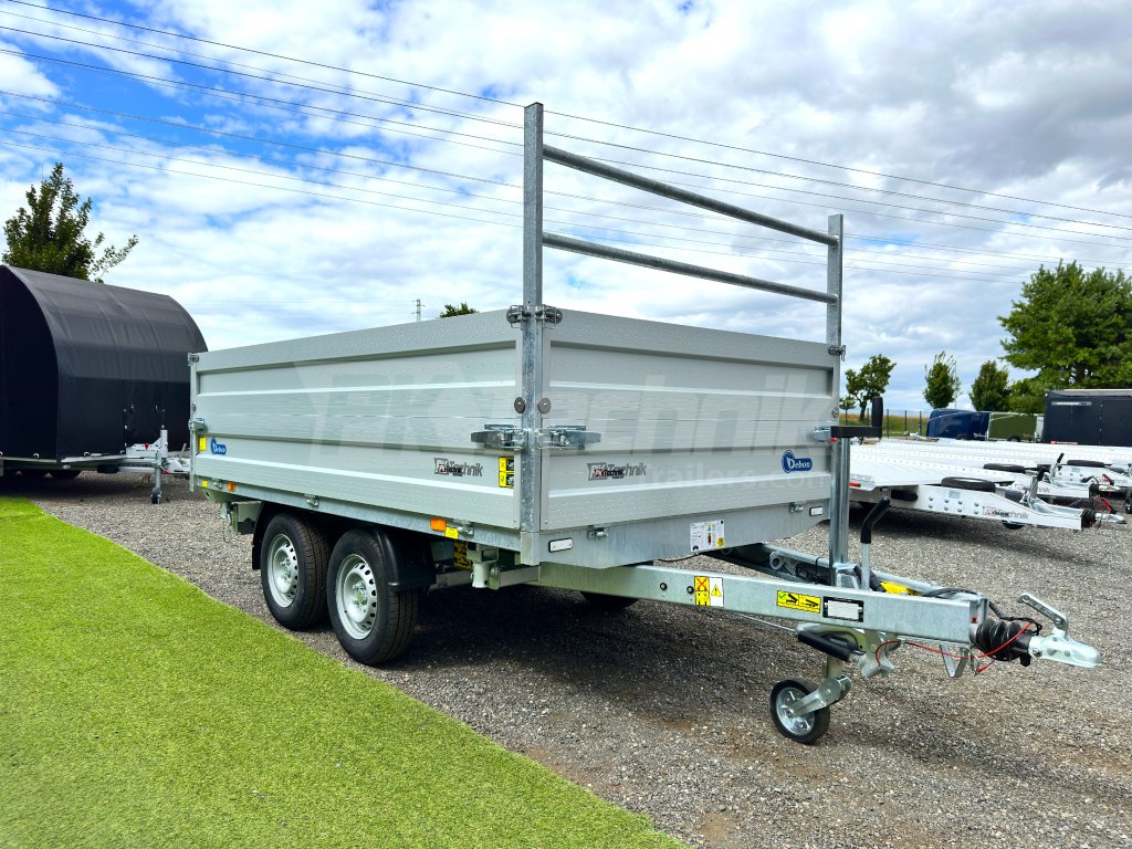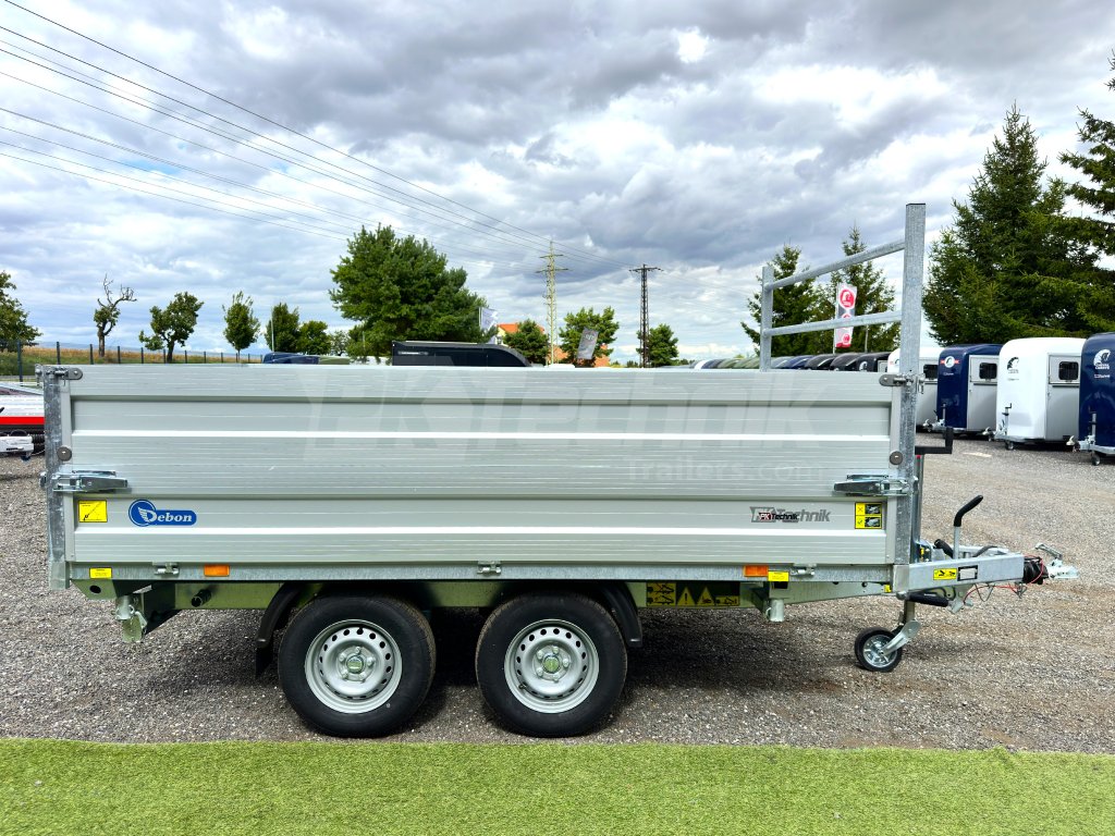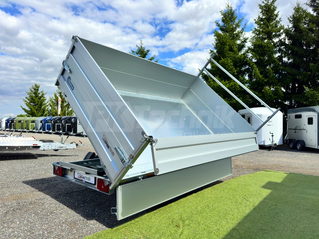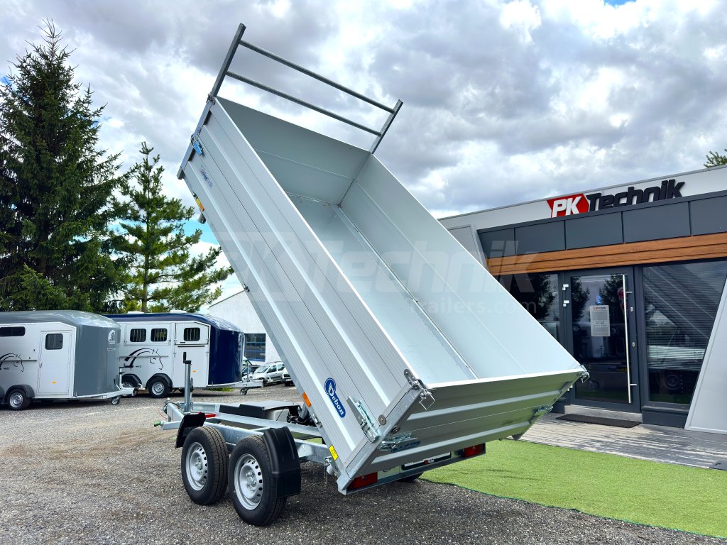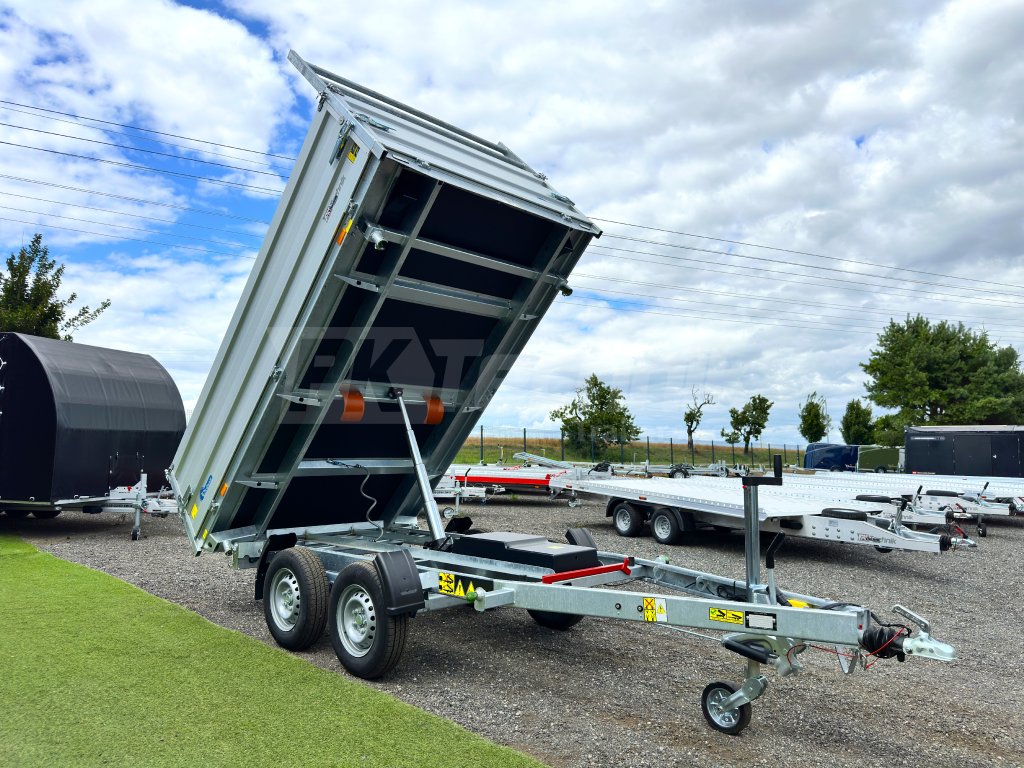 Hydraulicznie składana 3-stronna uniwersalna przyczepa płaska 300x180x35cm wiodącej francuskiej firmy Cheval Liberté Debon TIPPER PW 2.4 LUX z wbudowanym akumulatorem do niezależnego przechylania nadwozia, bez konieczności podłączania do źródła zasilania. Wysoka jakość wykonania do codziennego, profesjonalnego użytku. Przyczepa zbudowana jest na ramie ze stali ocynkowanej, wyposażona w osie niemieckiej firmy KNOTT oraz zdejmowane burty wykonane z anodowanych profili aluminiowych EUROLOCK, które są składane ze wszystkich stron i łatwo zdejmowane. Ponadto, dzięki możliwości demontażu nie tylko wszystkich ścian bocznych, ale także wszystkich słupków, naczepę można przekształcić w płaską platformę do transportu szerokiej gamy ładunków. Podłoga nadbudowy wykonana jest z wodoodpornej sklejki przyczepowej, pokrytej ocynkowaną blachą dla jeszcze dłuższej żywotności i ogólnej trwałości przyczepy. Przestrzeń ładunkowa jest wyposażona w 8 zaczepów do mocowania przewożonego ładunku. Wysokiej jakości przetwarzanie z najnowszą technologią do codziennego użytku profesjonalnego.