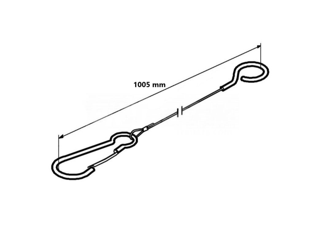 Pojistné lanko pro nájezdovou brzdu AL-KO 2,8VB. Lanko má délku 1005 mm a je opatřeno háčkem, který se provléká otvorem v páce ruční brzdy a následně se zajišťuje ohnutím pomocí velkých kleští.