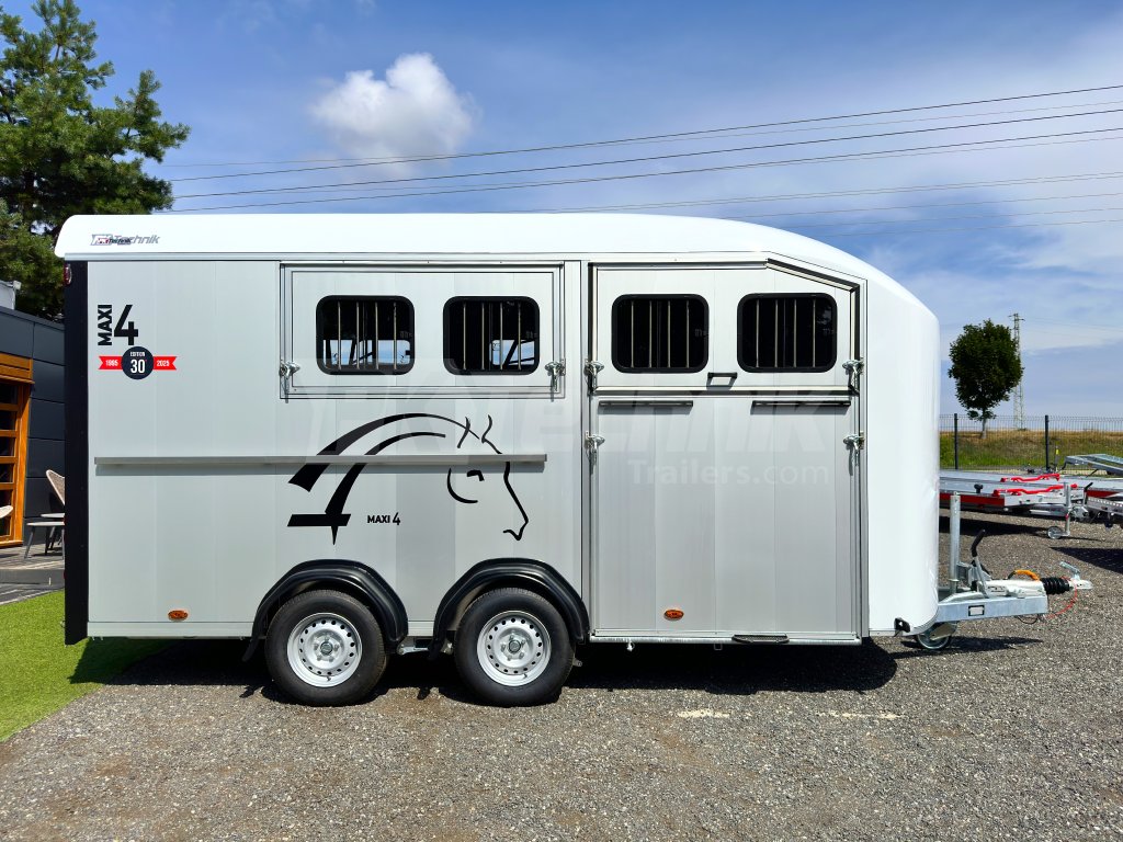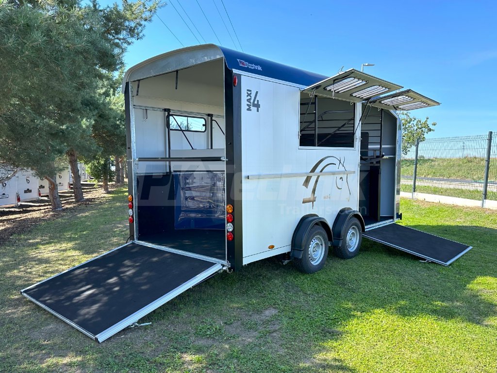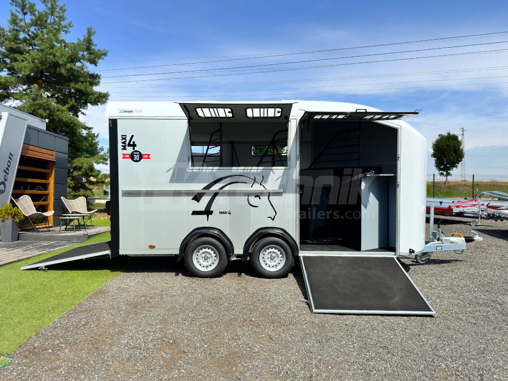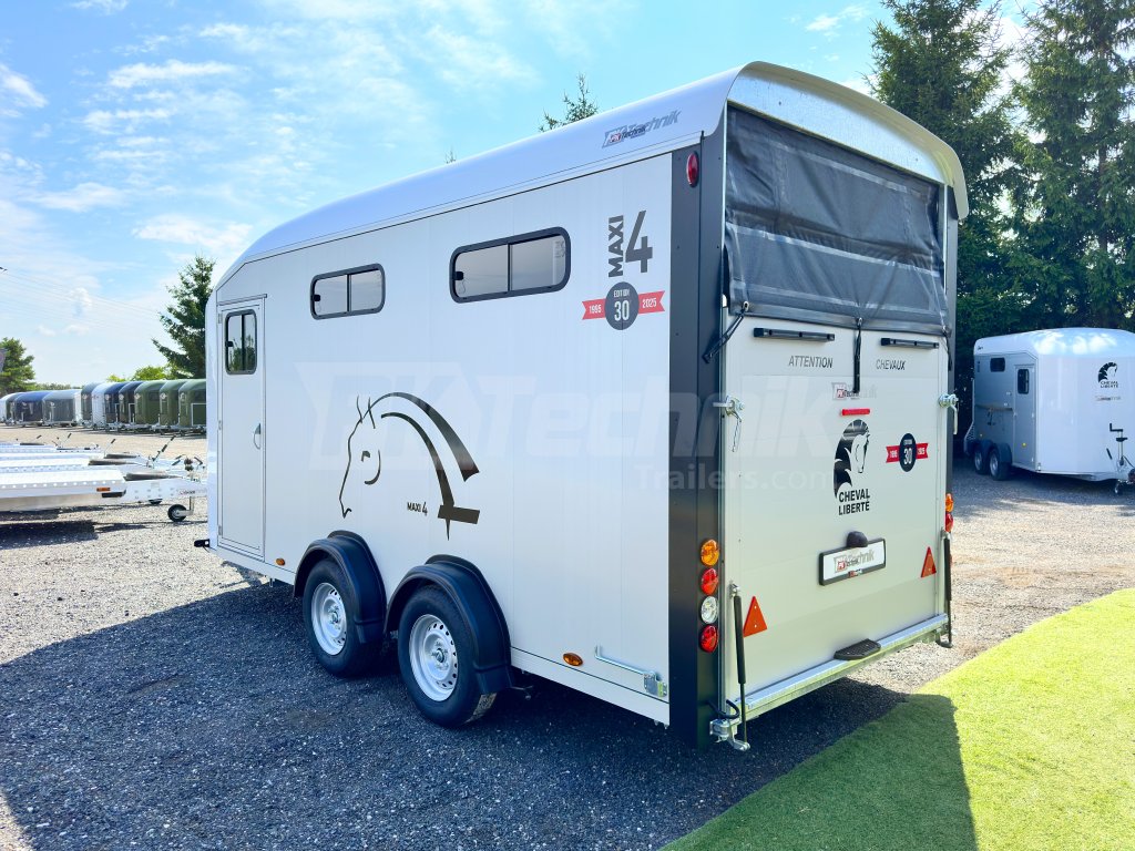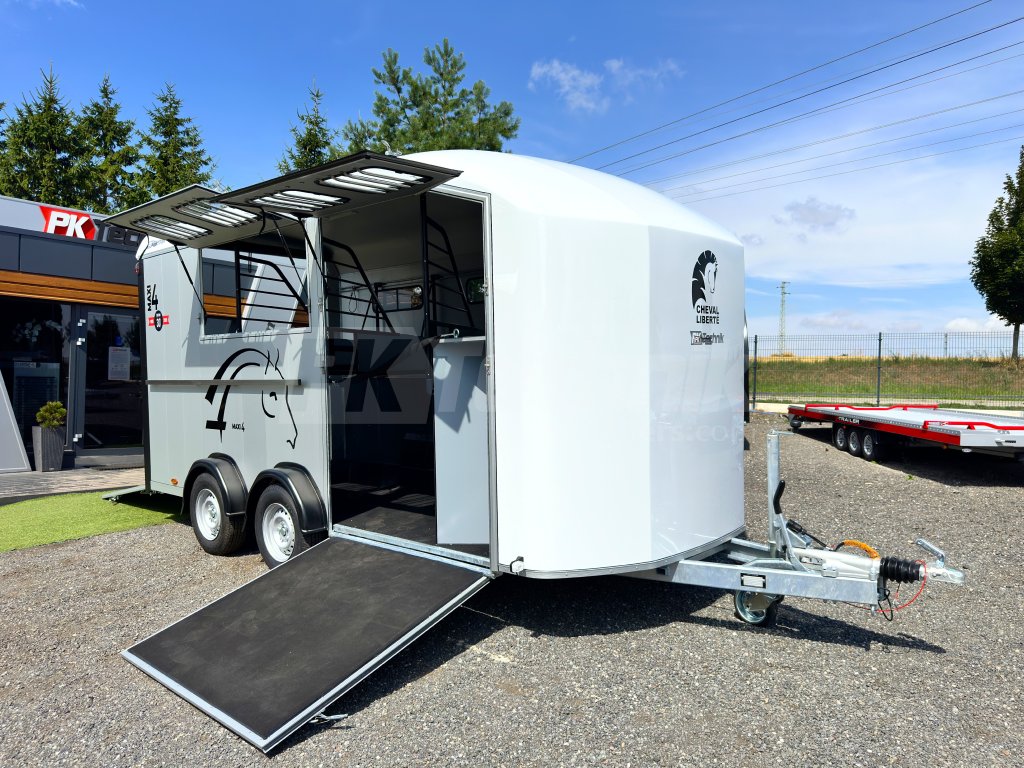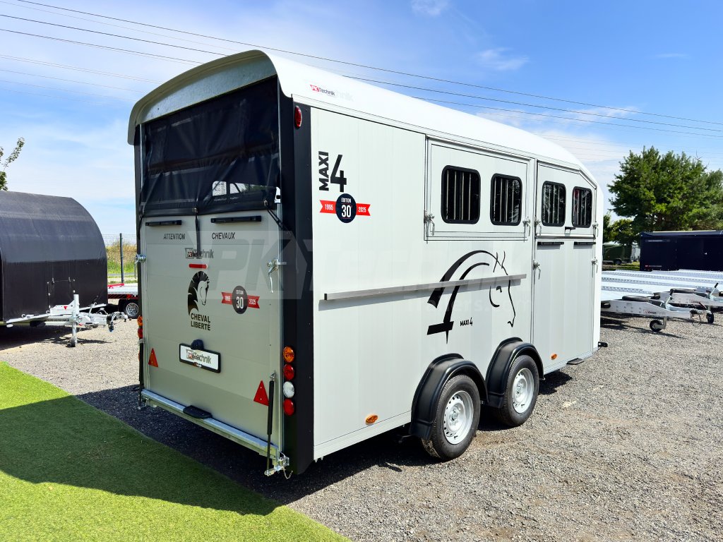 Přívěs pro čtyři koně Cheval Liberté MAXI 4 od renomovaného francouzského výrobce Cheval Liberté je určený pro ty, kteří hledají velký přívěs pro bezpečnou přepravu čtyř velkých koní v šikmém stání. Komfortní snížený podvozek Pullman 2 s nezávislými rameny, pružinami a tlumiči již ve standardní výbavě posouvá přívěs kvalitativně mezi špičku ve své kategorii. Boční stěny, zadní rampa a podlaha přívěsu jsou vyrobeny z hliníkových panelů. Karoserie je vyrobena monoblokového laminátu. Mezi přednosti modelů řady MAXI patří charakteristické diagonální stání koní, a přední výstupní rampa, která výrazně usnadňuje výstup koní přímou chůzí vpřed.
