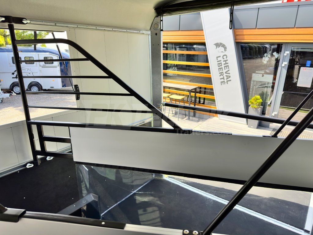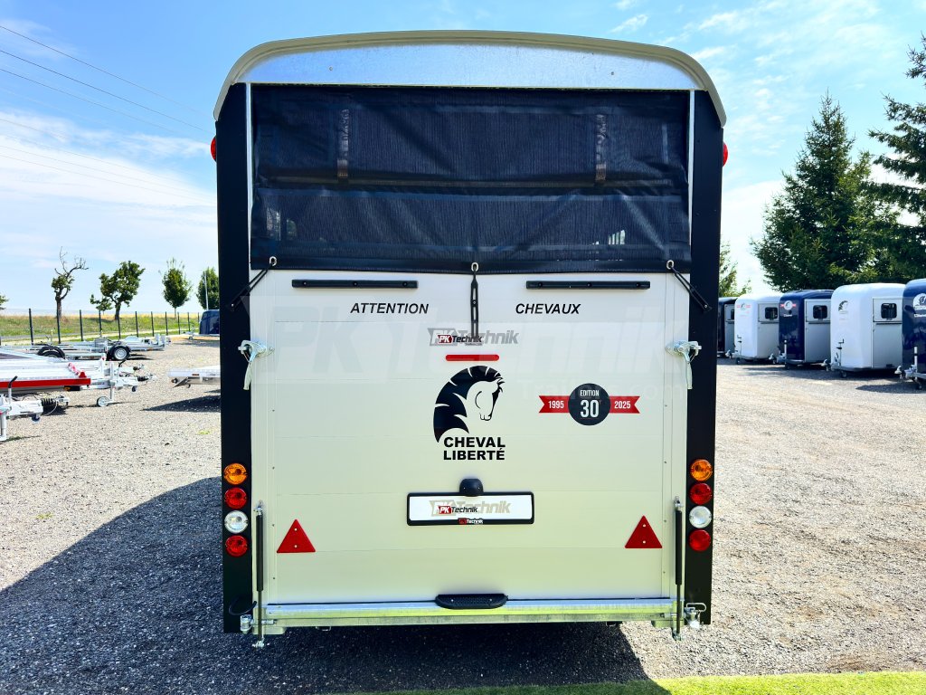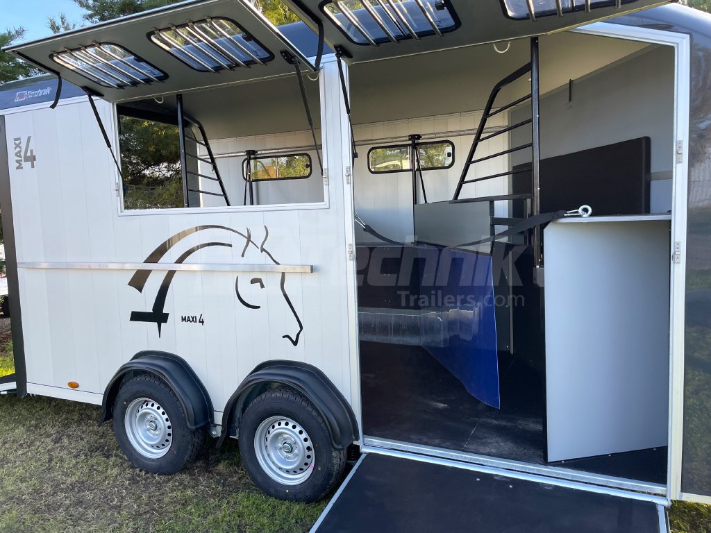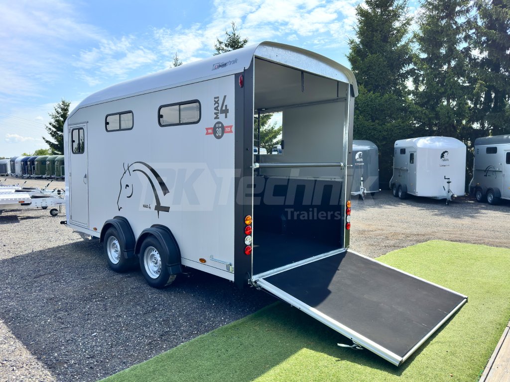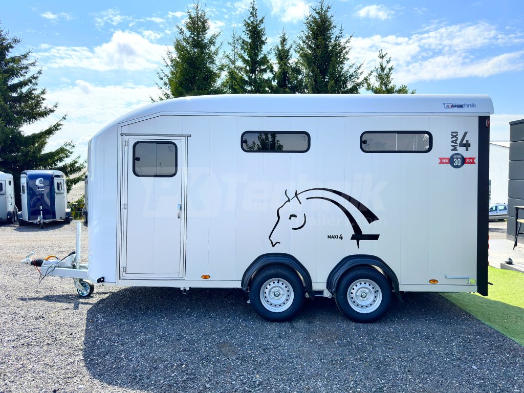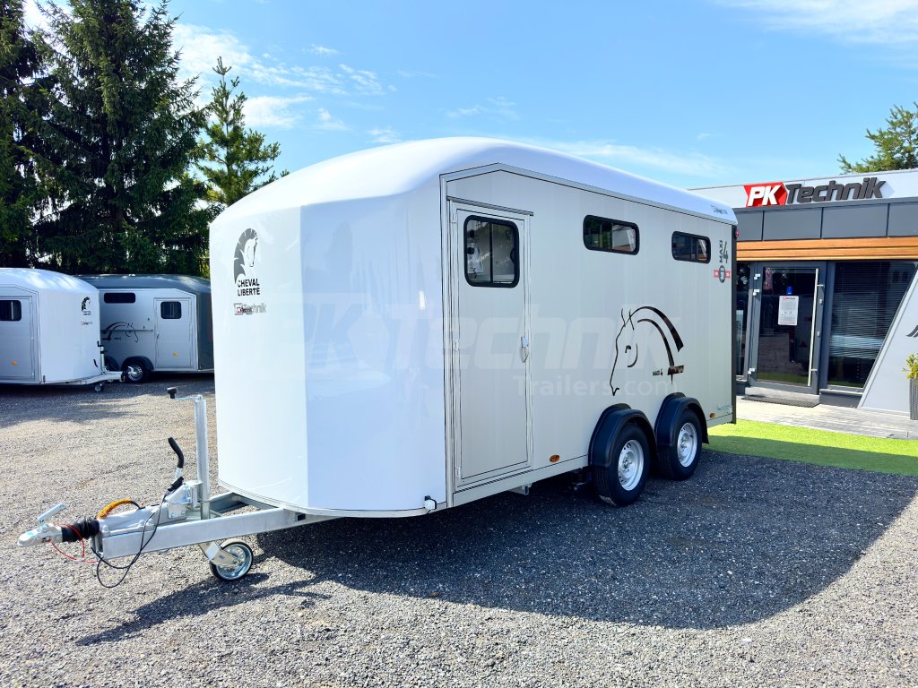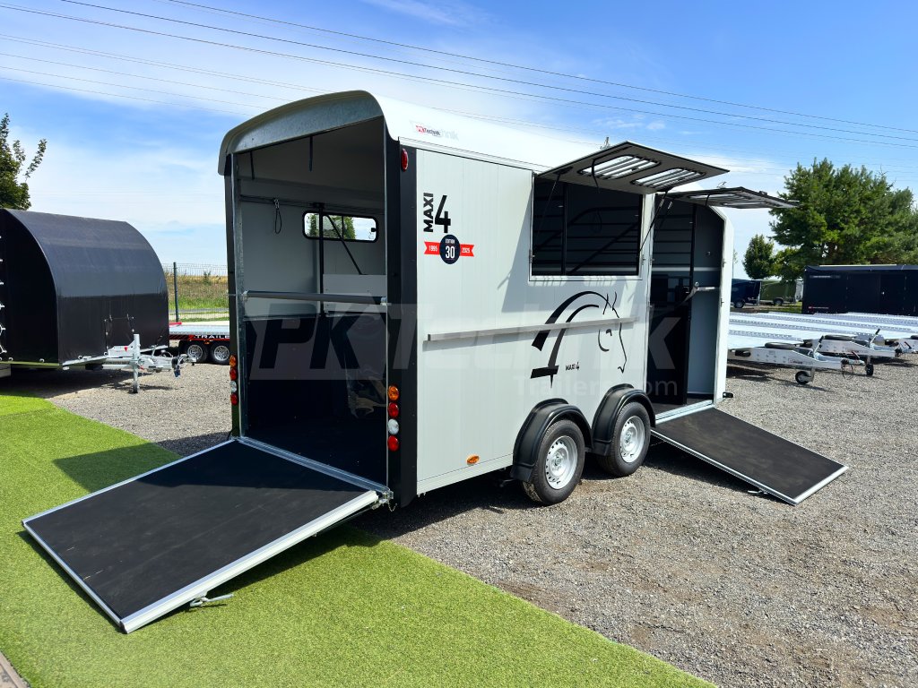 Přívěs pro čtyři koně Cheval Liberté MAXI 4 od renomovaného francouzského výrobce Cheval Liberté je určený pro ty, kteří hledají velký přívěs pro bezpečnou přepravu čtyř velkých koní v šikmém stání. Komfortní snížený podvozek Pullman 2 s nezávislými rameny, pružinami a tlumiči již ve standardní výbavě posouvá přívěs kvalitativně mezi špičku ve své kategorii. Boční stěny, zadní rampa a podlaha přívěsu jsou vyrobeny z hliníkových panelů. Karoserie je vyrobena monoblokového laminátu. Mezi přednosti modelů řady MAXI patří charakteristické diagonální stání koní, a přední výstupní rampa, která výrazně usnadňuje výstup koní přímou chůzí vpřed.