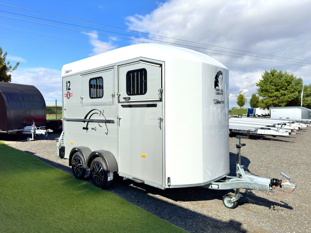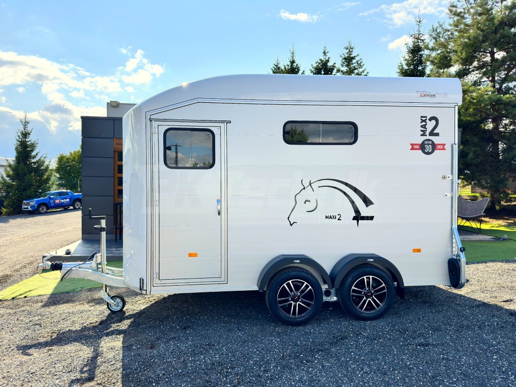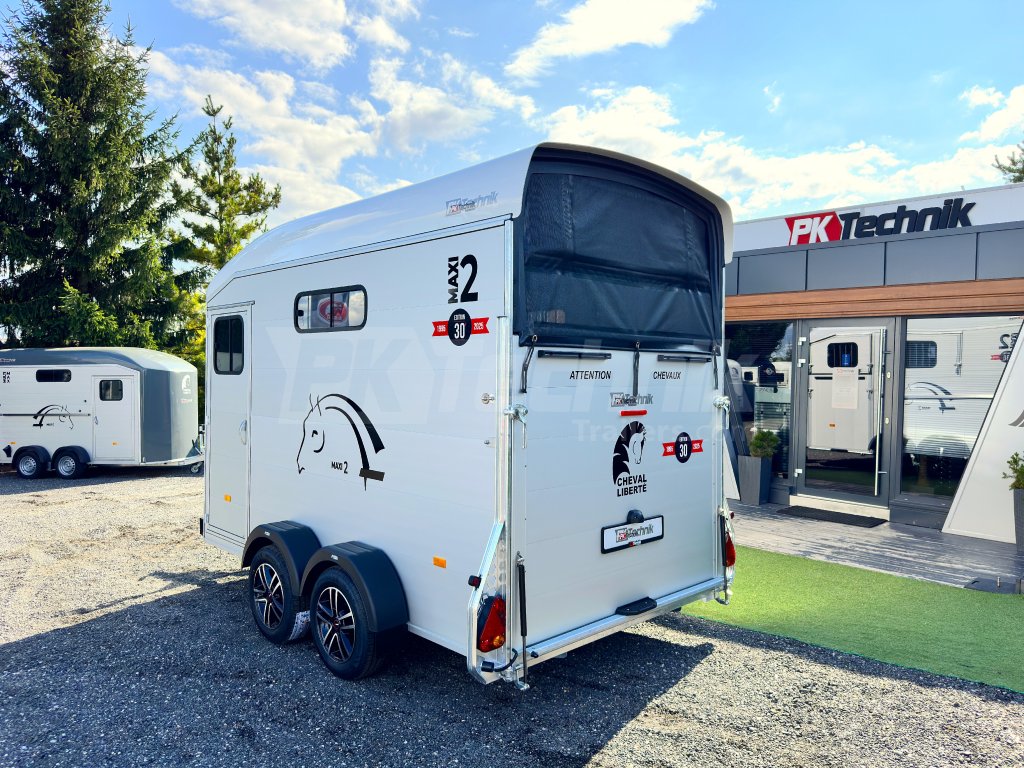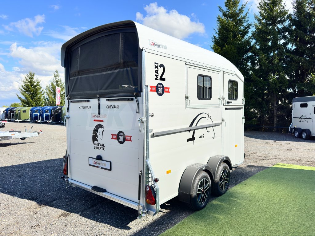 Přívěs Cheval Liberté MAXI 2 od renomovaného francouzského výrobce Cheval Liberté je určený pro ty, kteří hledají velký přívěs pro bezpečnou přepravu dvou velkých koní v šikmém stání. Komfortní snížený podvozek Pullman 2 s nezávislými rameny, pružinami a tlumiči již ve standardní výbavě posouvá přívěs kvalitativně mezi špičku ve své kategorii. Ochrana hlavního ocelového rámu proti korozi je zajištěna žárovým zinkováním. Boční stěny a podlaha přívěsu z hliníkových panelů, střešní a přední část z monoblokového 5-ti vrstvého laminátu o tloušťce 8 mm s integrovanými ocelovými výztuhami, zajišťují nízkou provozní hmotnost, dokonalý komfort při přepravě a také dlouhou životnost přívěsu. Mezi přednosti modelů MAXI patří charakteristická širší a nižší přední vykládací rampa, která výrazně usnadňuje výstup koní, pro které je obtížné vycházet z přívěsu pozadu.
