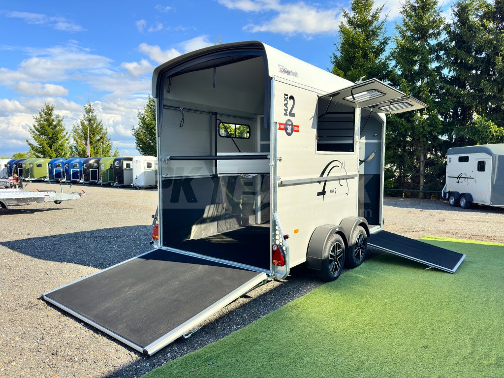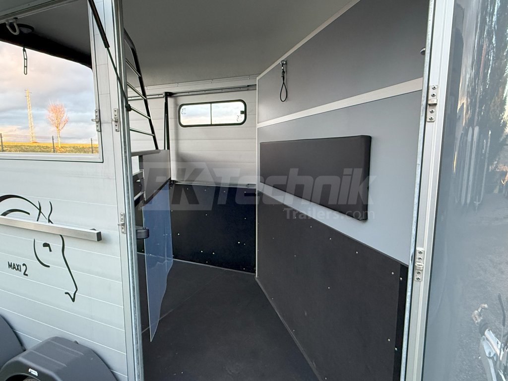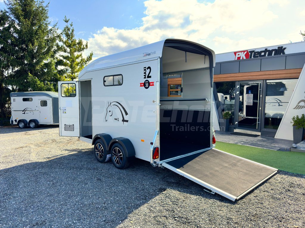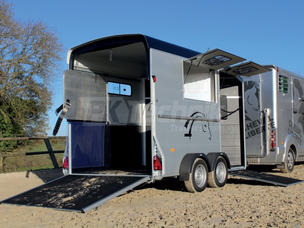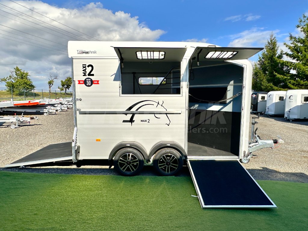 Přívěs Cheval Liberté MAXI 2 od renomovaného francouzského výrobce Cheval Liberté je určený pro ty, kteří hledají velký přívěs pro bezpečnou přepravu dvou velkých koní v šikmém stání. Komfortní snížený podvozek Pullman 2 s nezávislými rameny, pružinami a tlumiči již ve standardní výbavě posouvá přívěs kvalitativně mezi špičku ve své kategorii. Ochrana hlavního ocelového rámu proti korozi je zajištěna žárovým zinkováním. Boční stěny a podlaha přívěsu z hliníkových panelů, střešní a přední část z monoblokového 5-ti vrstvého laminátu o tloušťce 8 mm s integrovanými ocelovými výztuhami, zajišťují nízkou provozní hmotnost, dokonalý komfort při přepravě a také dlouhou životnost přívěsu. Mezi přednosti modelů MAXI patří charakteristická širší a nižší přední vykládací rampa, která výrazně usnadňuje výstup koní, pro které je obtížné vycházet z přívěsu pozadu.