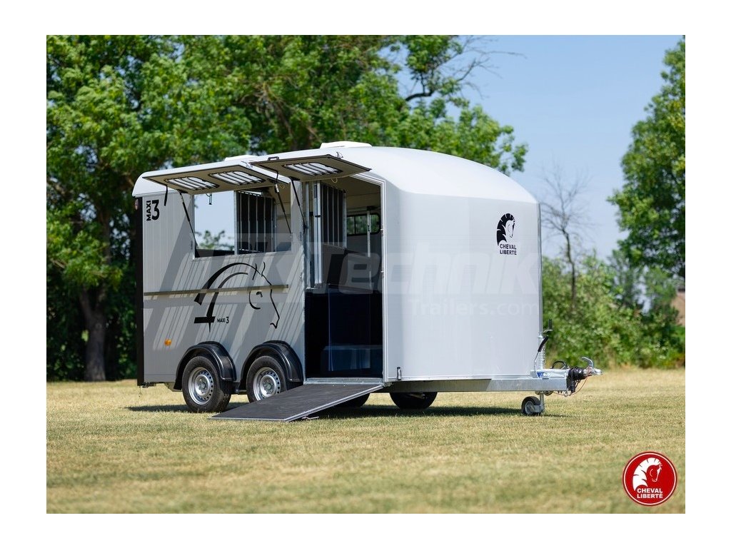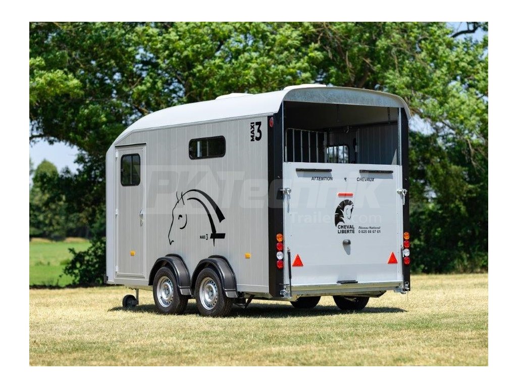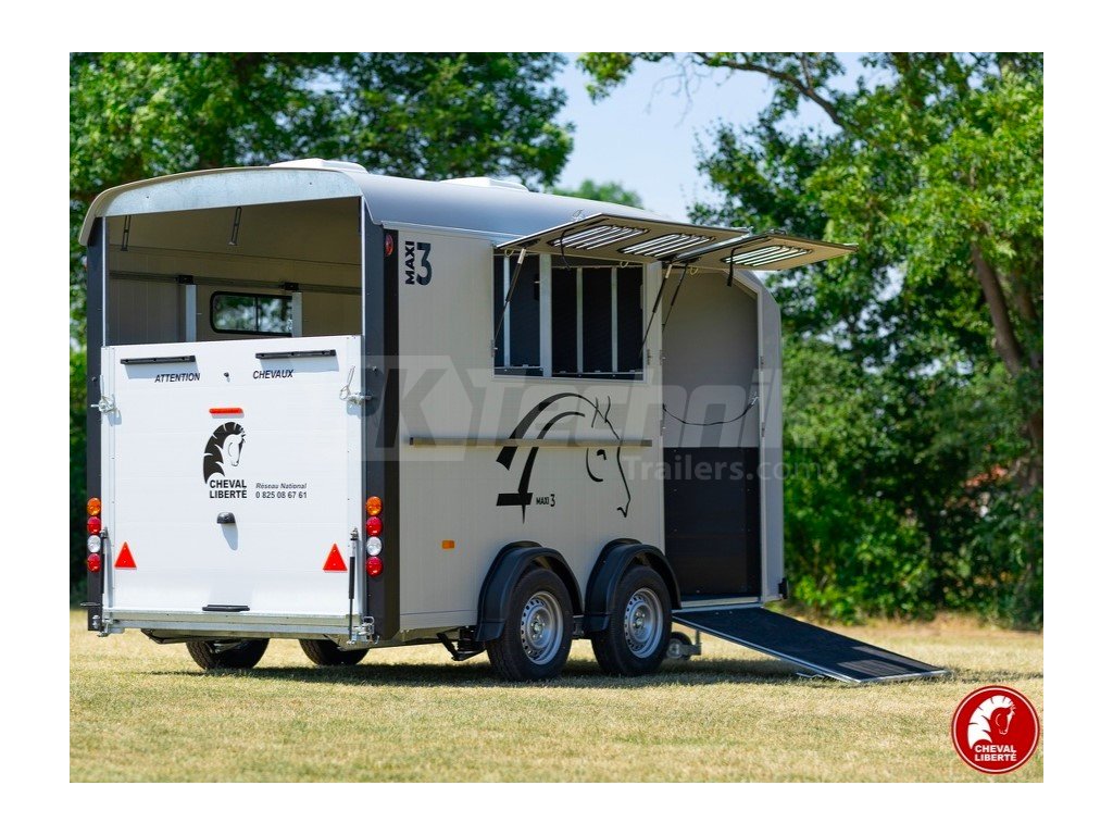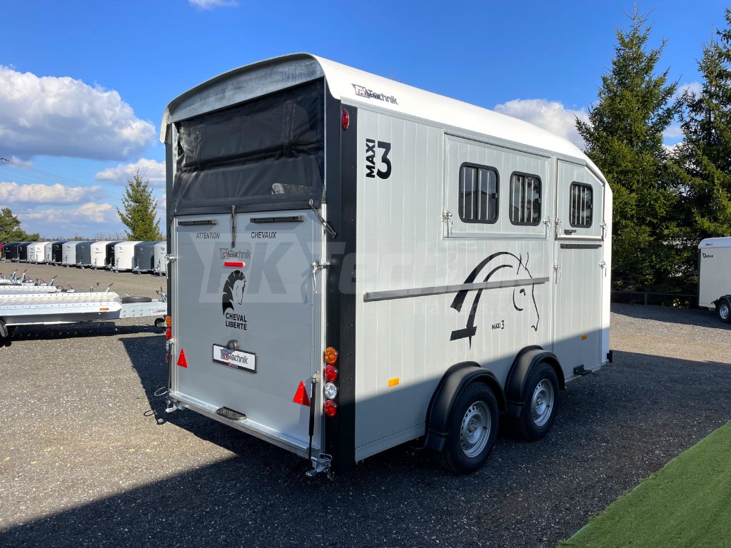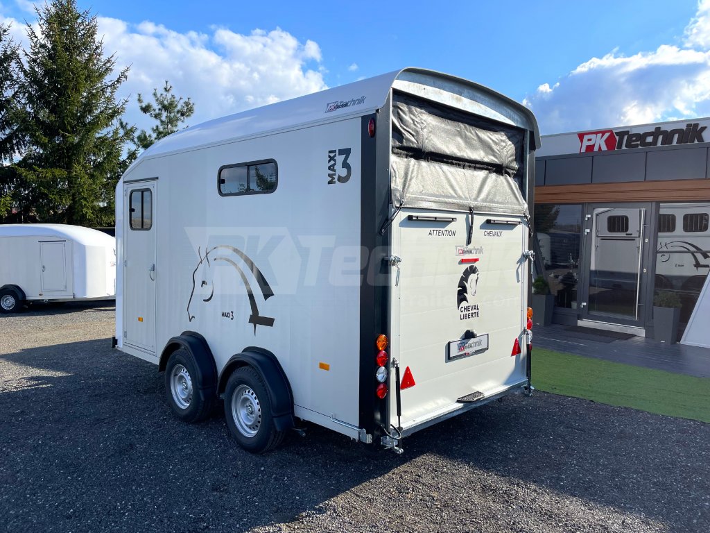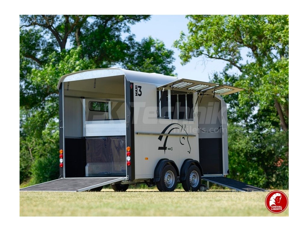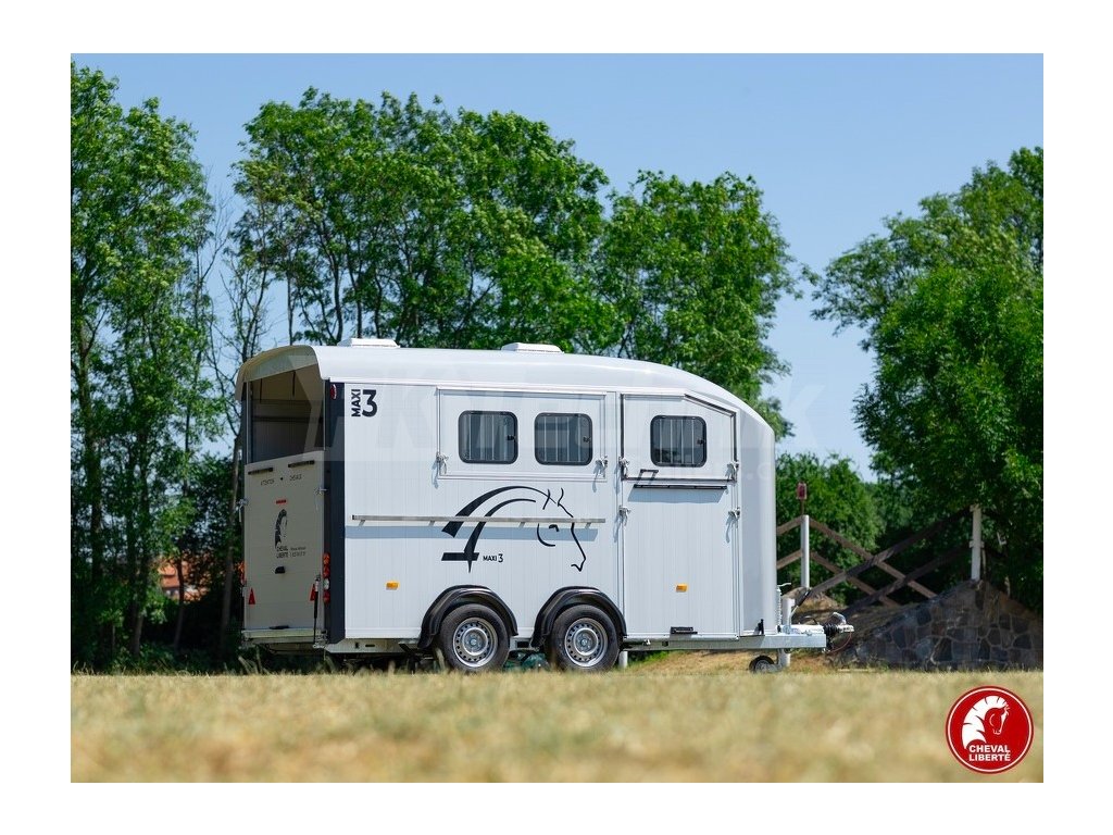 Přívěs Cheval Liberté MAXI 3 od renomovaného francouzského výrobce Cheval Liberté je určený pro ty, kteří hledají velký přívěs pro bezpečnou přepravu třech velkých koní v šikmém stání. Komfortní snížený podvozek Pullman 2 s nezávislými rameny, pružinami a tlumiči již ve standardní výbavě posouvá přívěs kvalitativně mezi špičku ve své kategorii. Ochrana hlavního ocelového rámu proti korozi je zajištěna žárovým zinkováním. Boční stěny a podlaha přívěsu z hliníkových panelů, střešní a přední část z monoblokového 5-ti vrstvého laminátu o tloušťce 8 mm s integrovanými ocelovými výztuhami, zajišťují nízkou provozní hmotnost, dokonalý komfort při přepravě a také dlouhou životnost přívěsu. Mezi přednosti modelů MAXI patří charakteristická širší a nižší přední vykládací rampa, která výrazně usnadňuje výstup koní, pro které je obtížné vycházet z přívěsu pozadu.