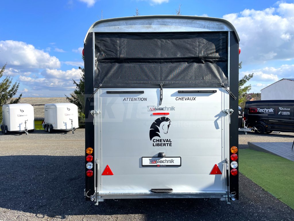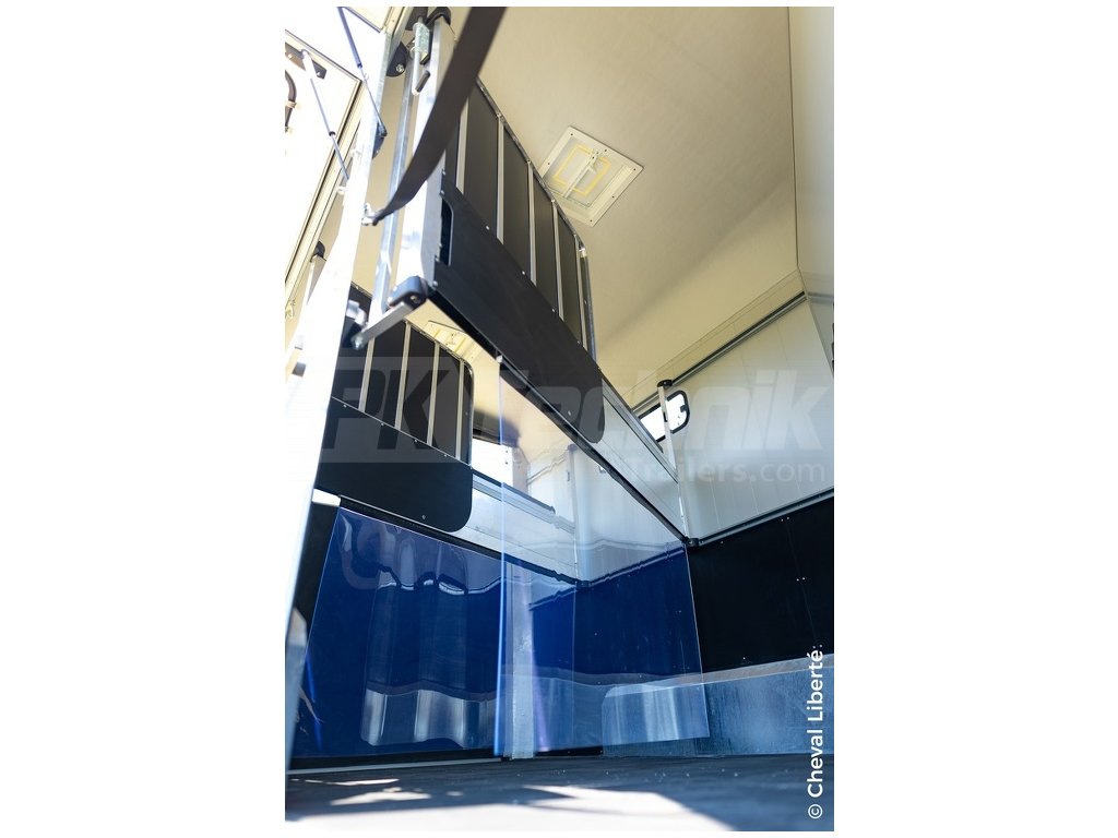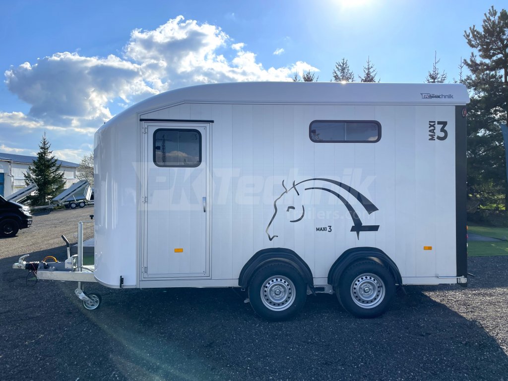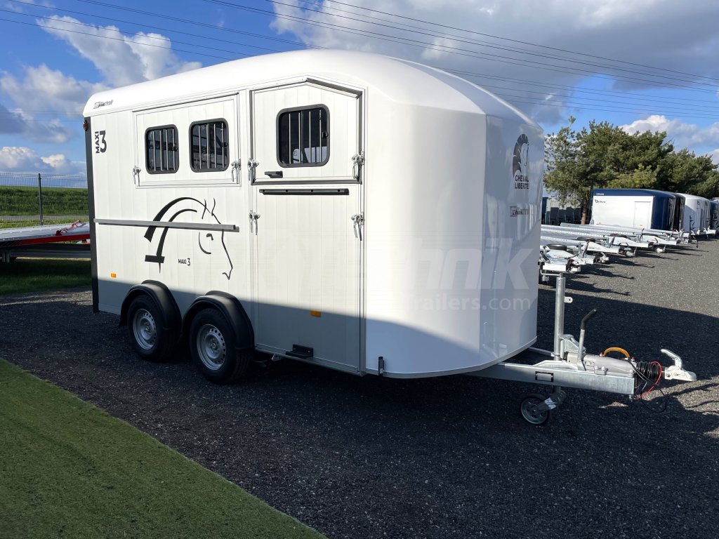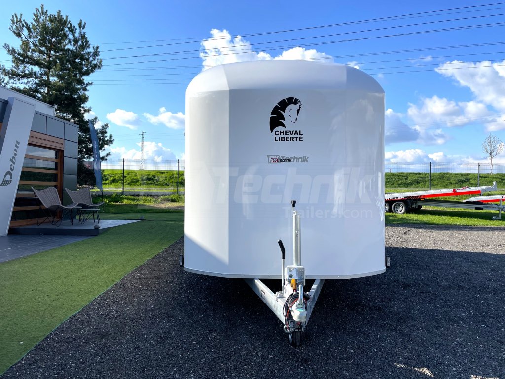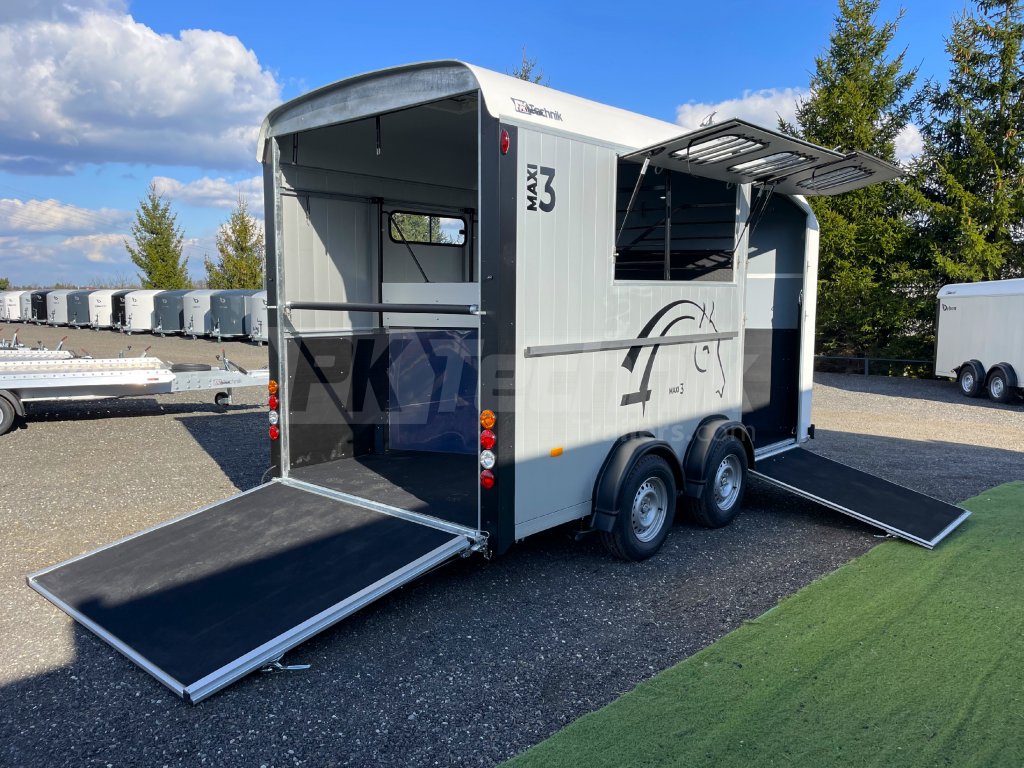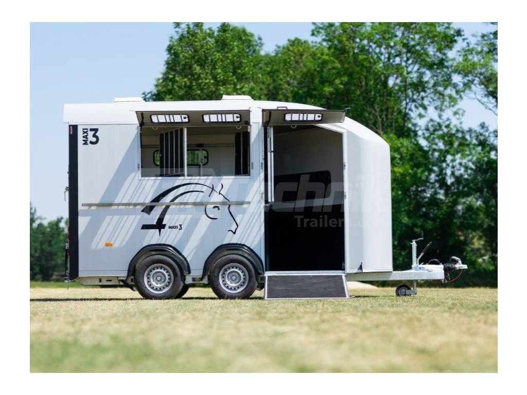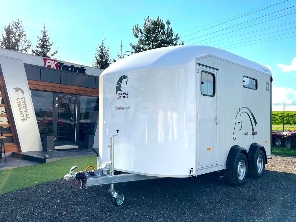 Přívěs Cheval Liberté MAXI 3 od renomovaného francouzského výrobce Cheval Liberté je určený pro ty, kteří hledají velký přívěs pro bezpečnou přepravu třech velkých koní v šikmém stání. Komfortní snížený podvozek Pullman 2 s nezávislými rameny, pružinami a tlumiči již ve standardní výbavě posouvá přívěs kvalitativně mezi špičku ve své kategorii. Ochrana hlavního ocelového rámu proti korozi je zajištěna žárovým zinkováním. Boční stěny a podlaha přívěsu z hliníkových panelů, střešní a přední část z monoblokového 5-ti vrstvého laminátu o tloušťce 8 mm s integrovanými ocelovými výztuhami, zajišťují nízkou provozní hmotnost, dokonalý komfort při přepravě a také dlouhou životnost přívěsu. Mezi přednosti modelů MAXI patří charakteristická širší a nižší přední vykládací rampa, která výrazně usnadňuje výstup koní, pro které je obtížné vycházet z přívěsu pozadu.